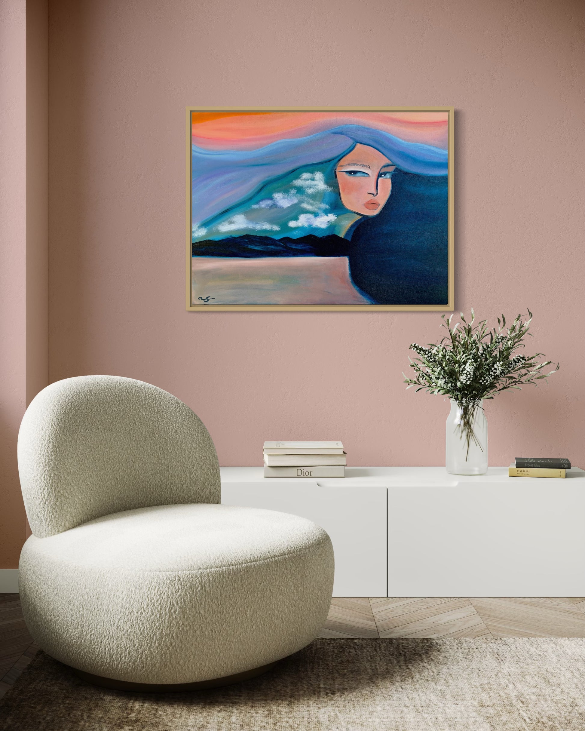 This artwork does not come framed. I recommend a floater frame for her or hung with the raw canvas edge exposed for a modern look.