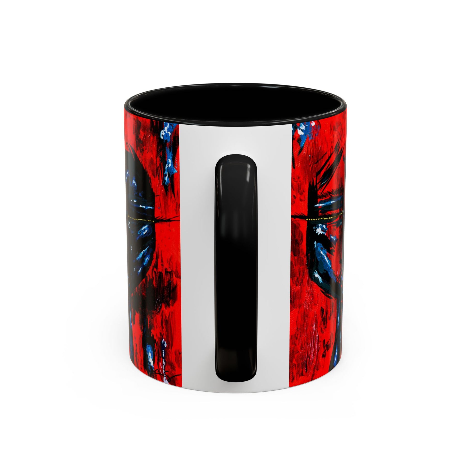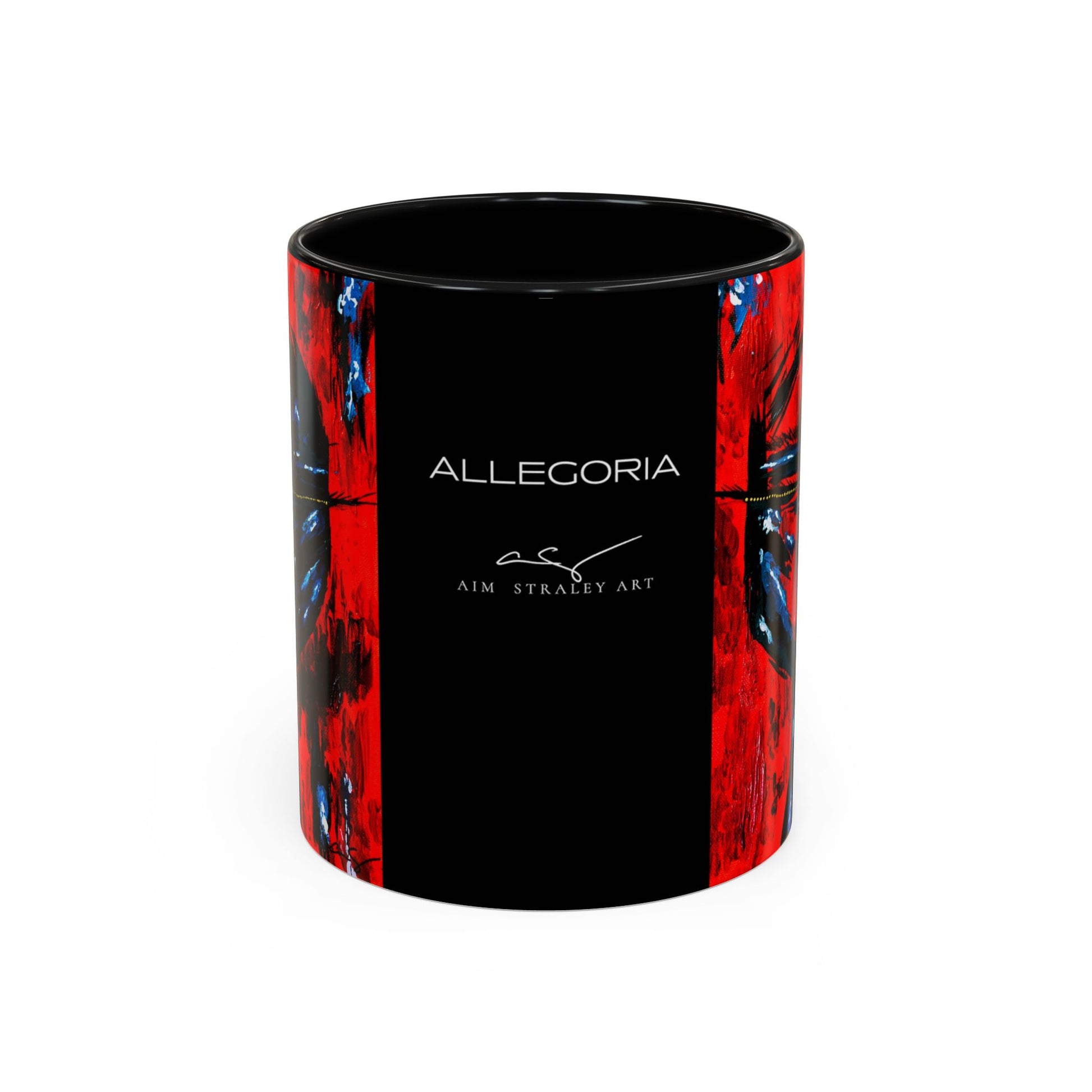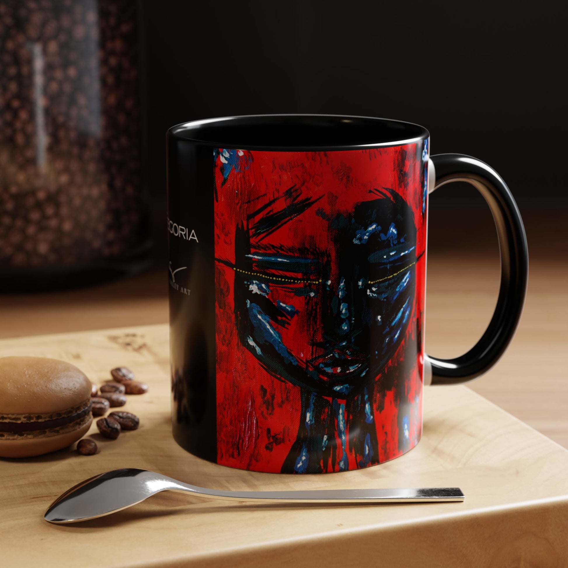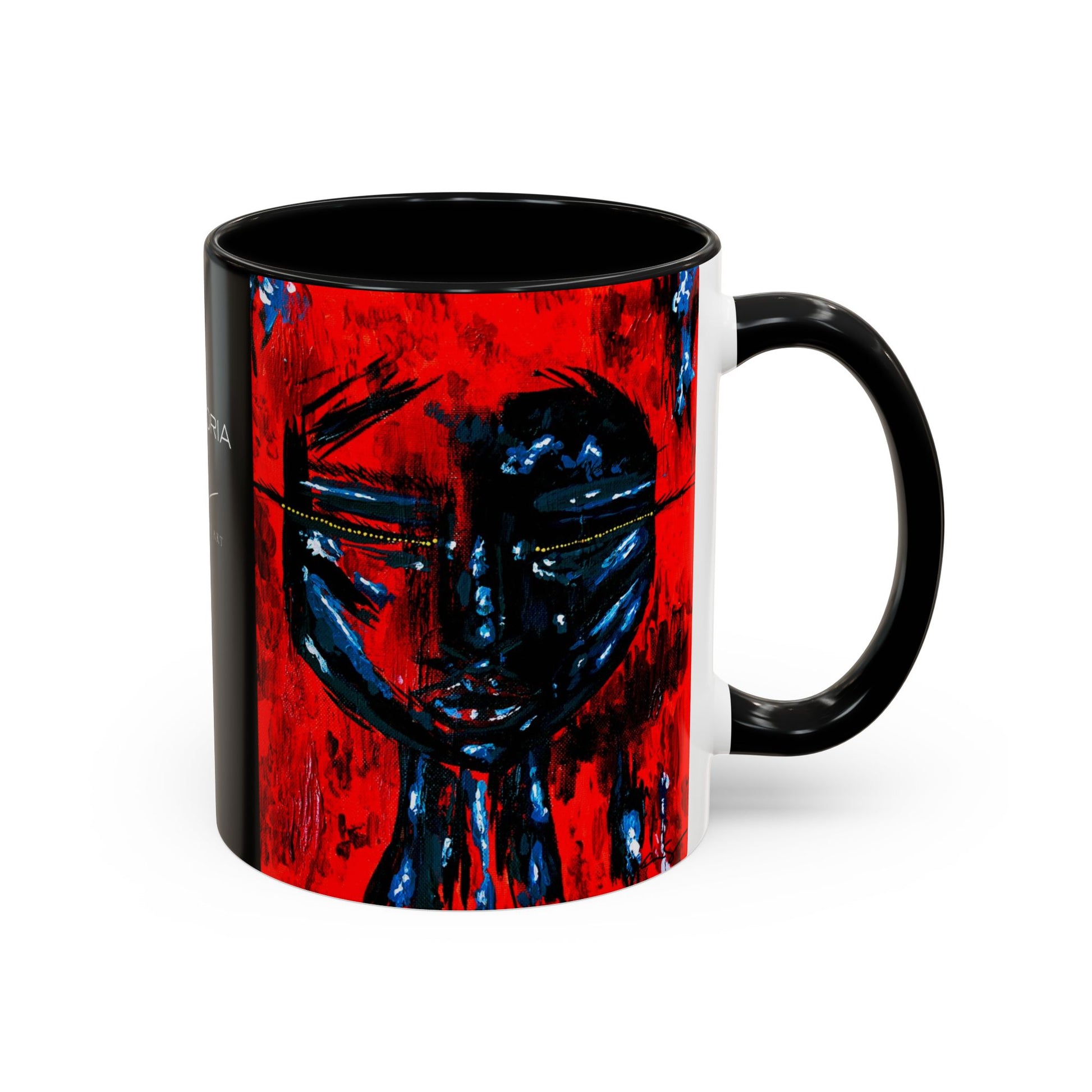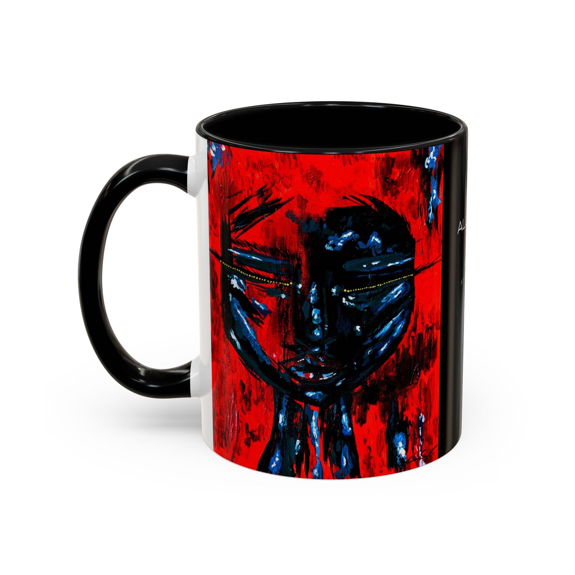 This mug is perfect for the abstract art and coffee lover in your life. Printed with my original red artwork "Allegoria" with a black interior and handle. Featuring an abstract, feminine face with pops of blue and yellow.