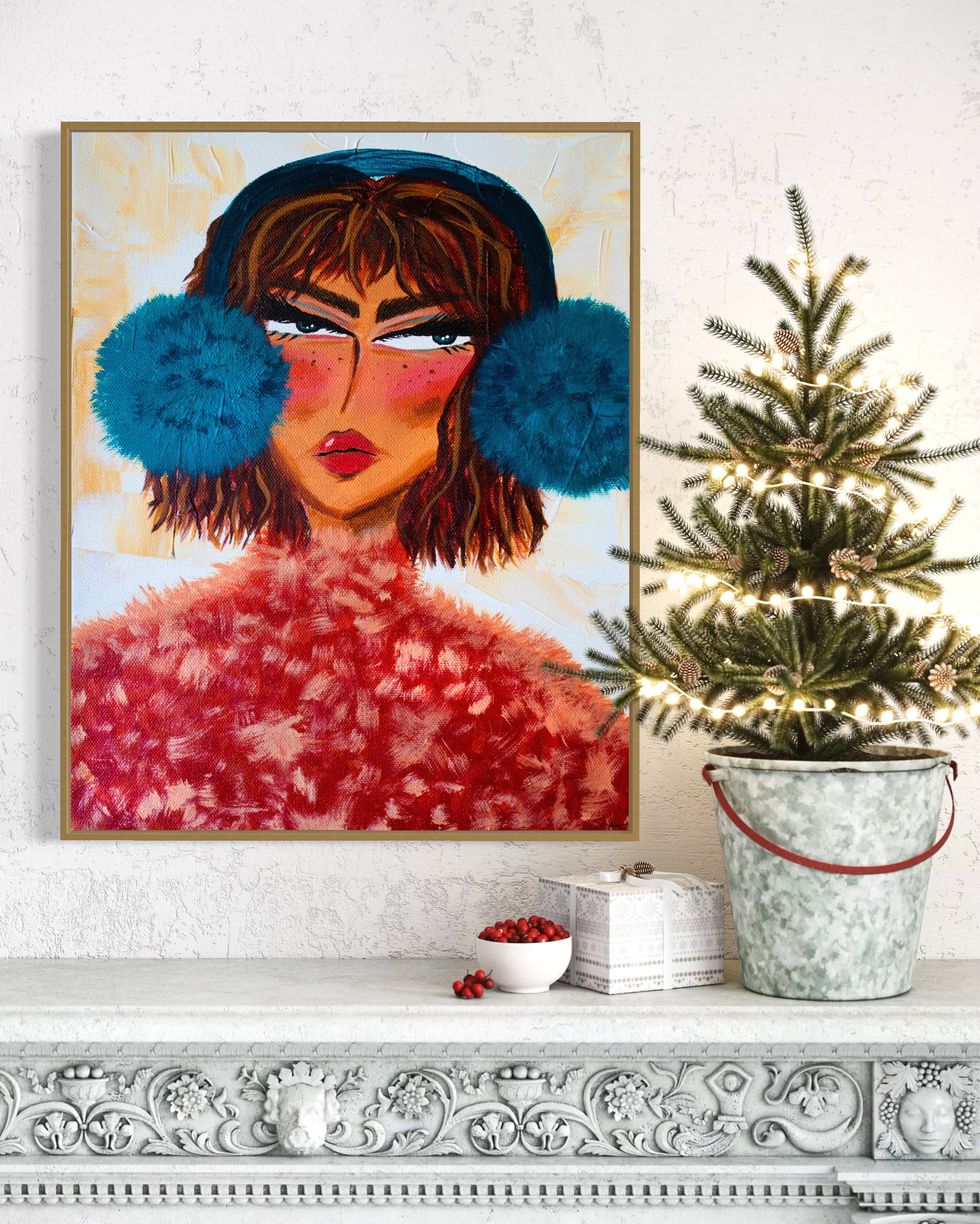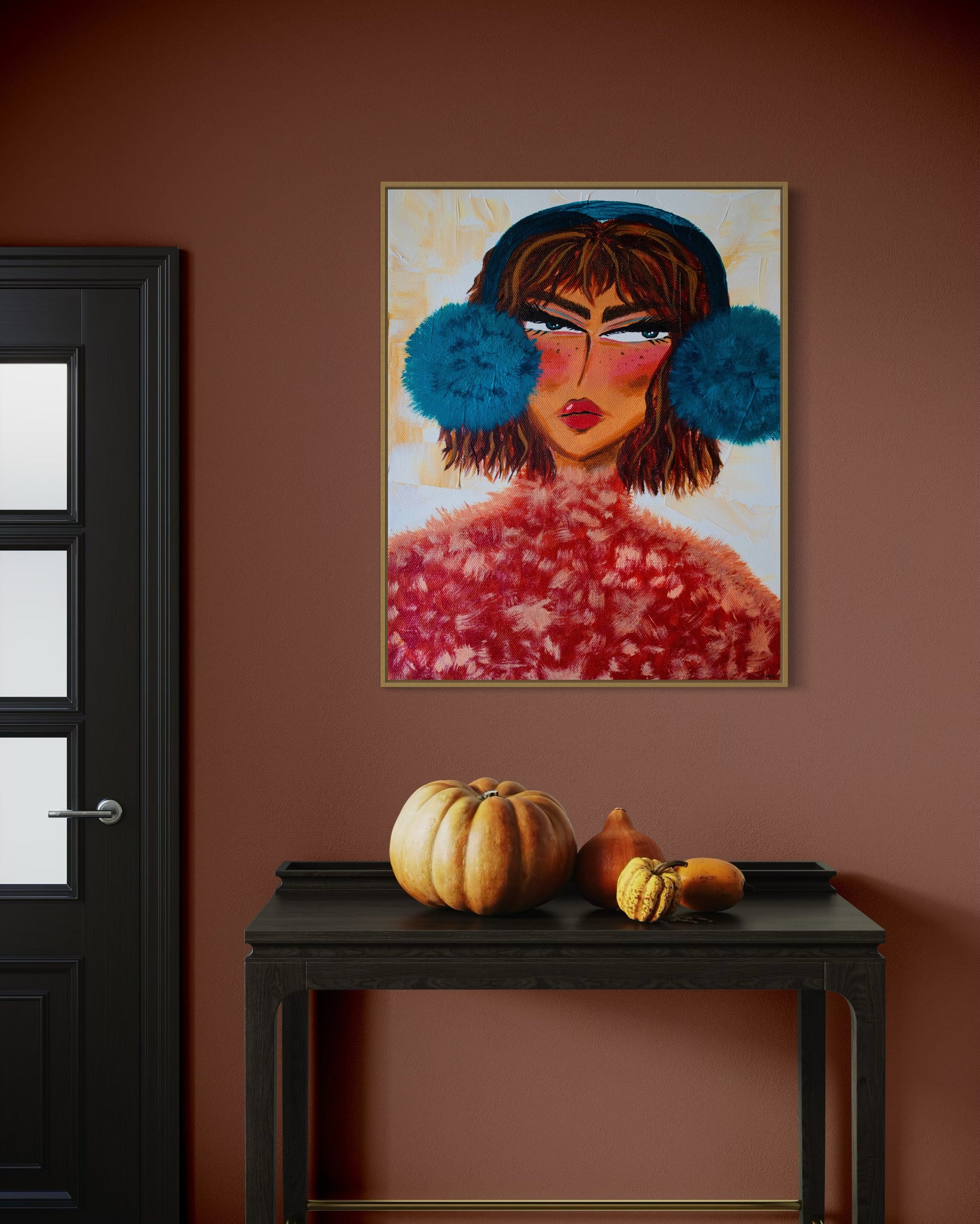 "Aprés-Ski." After a long day of skiing she's ready to order her martini and fondue. She's keeping warm in her soft coral sweater and fluffy teal earmuffs.