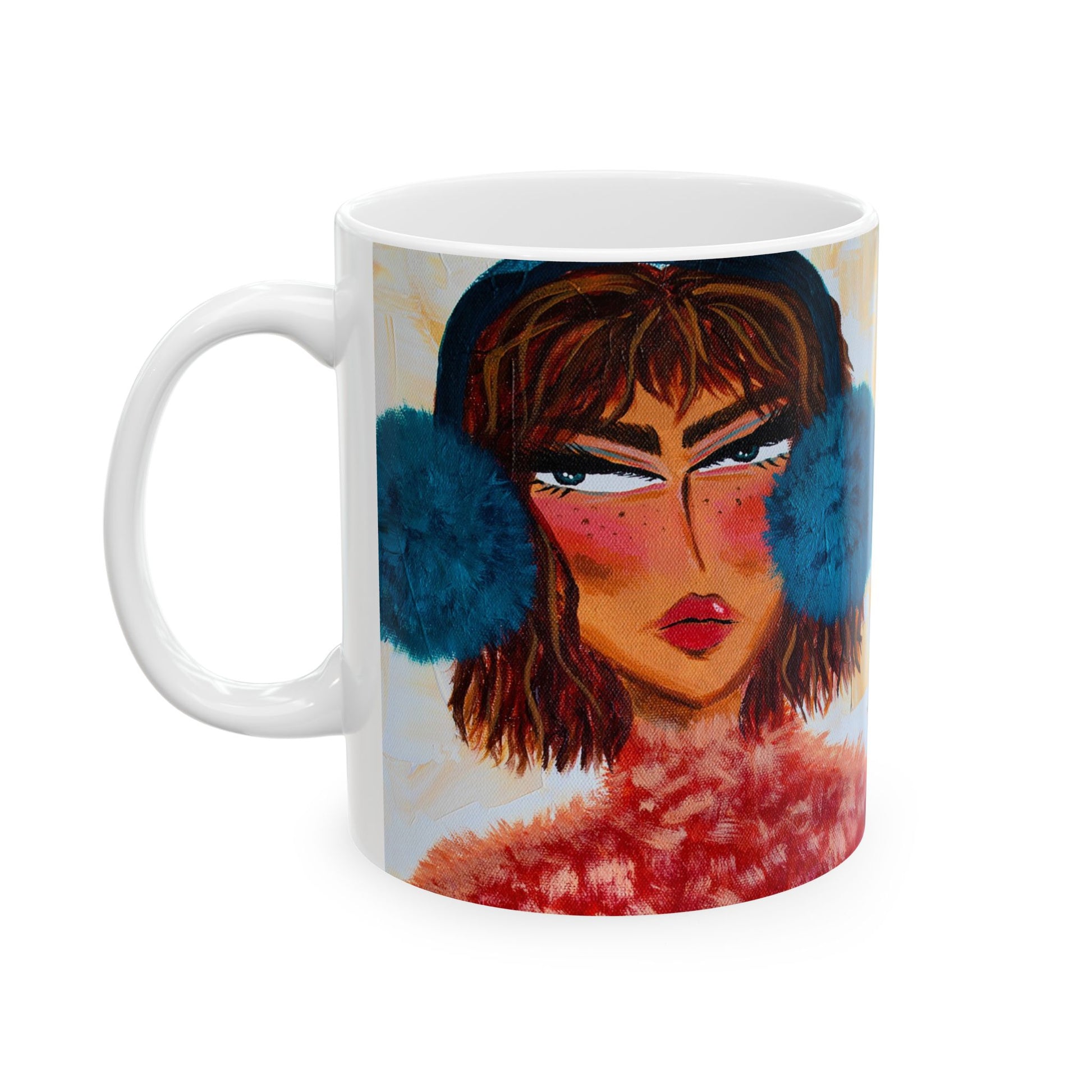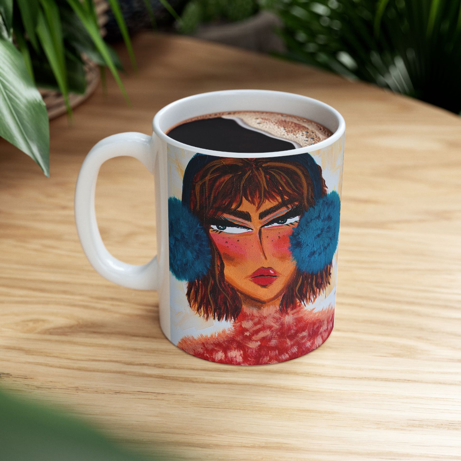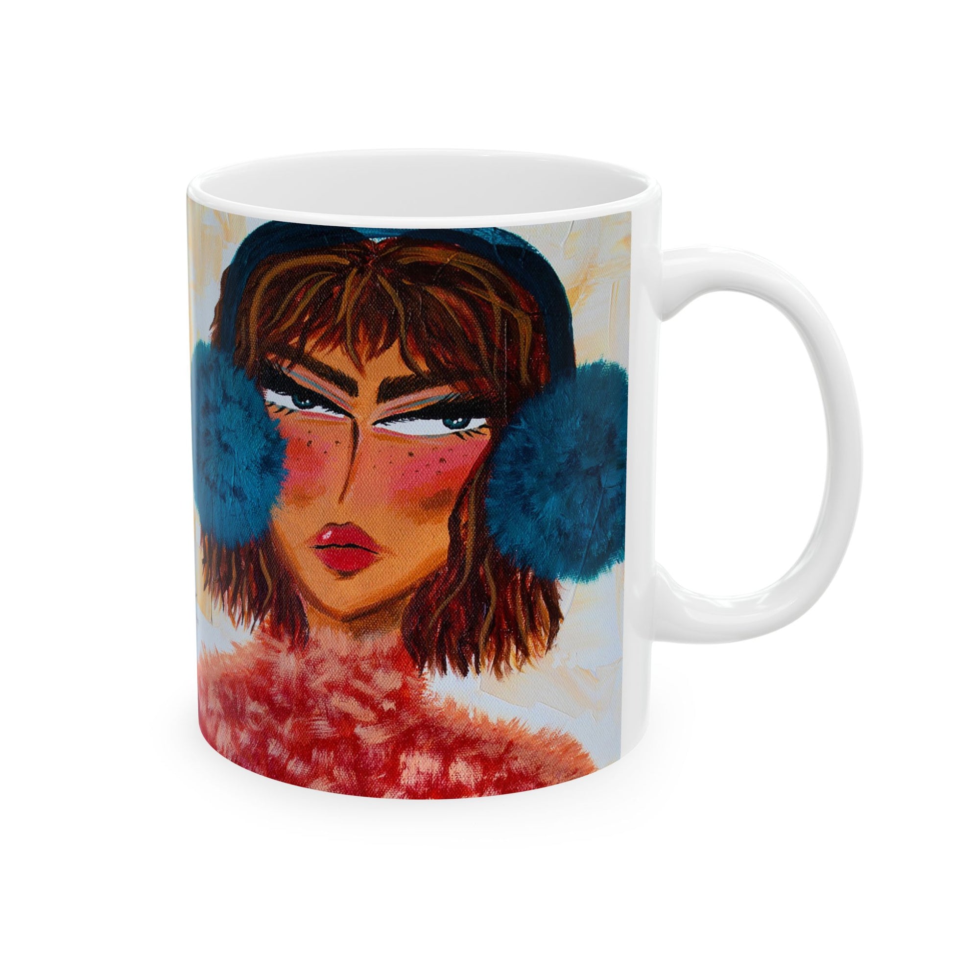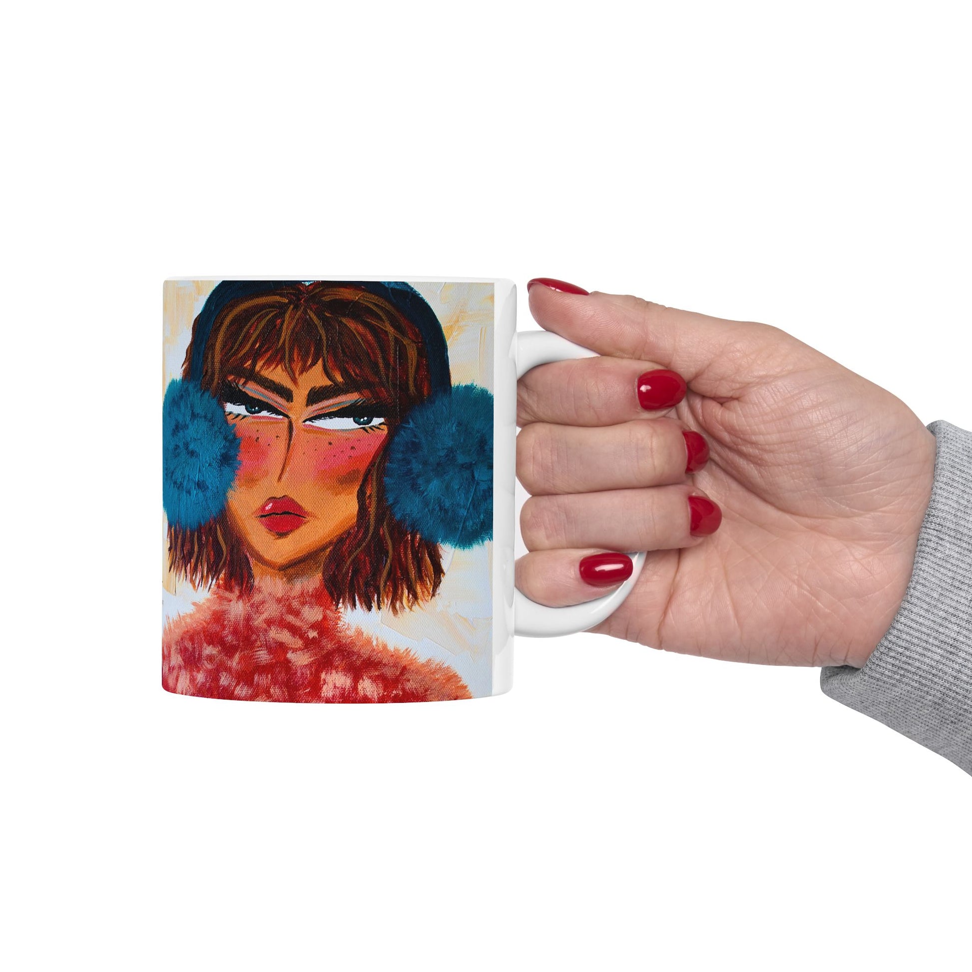 This 11oz coffee mug is printed with my original artwork "Apres Ski" with a white interior and handle. This cute fashion illustration makes a great winter gift! Featuring a woman wearing teal blue fuzzy earmuffs and a soft coral sweater.