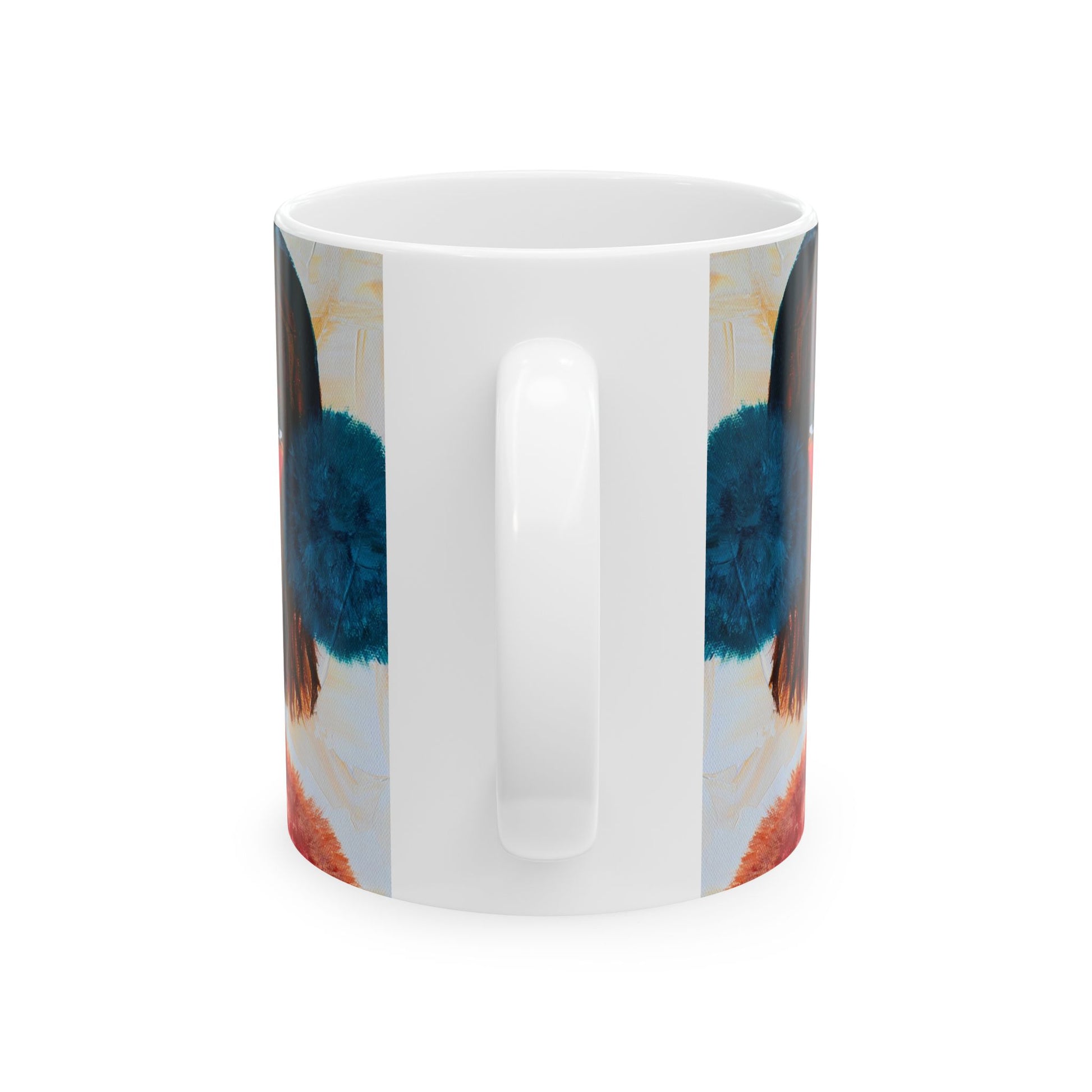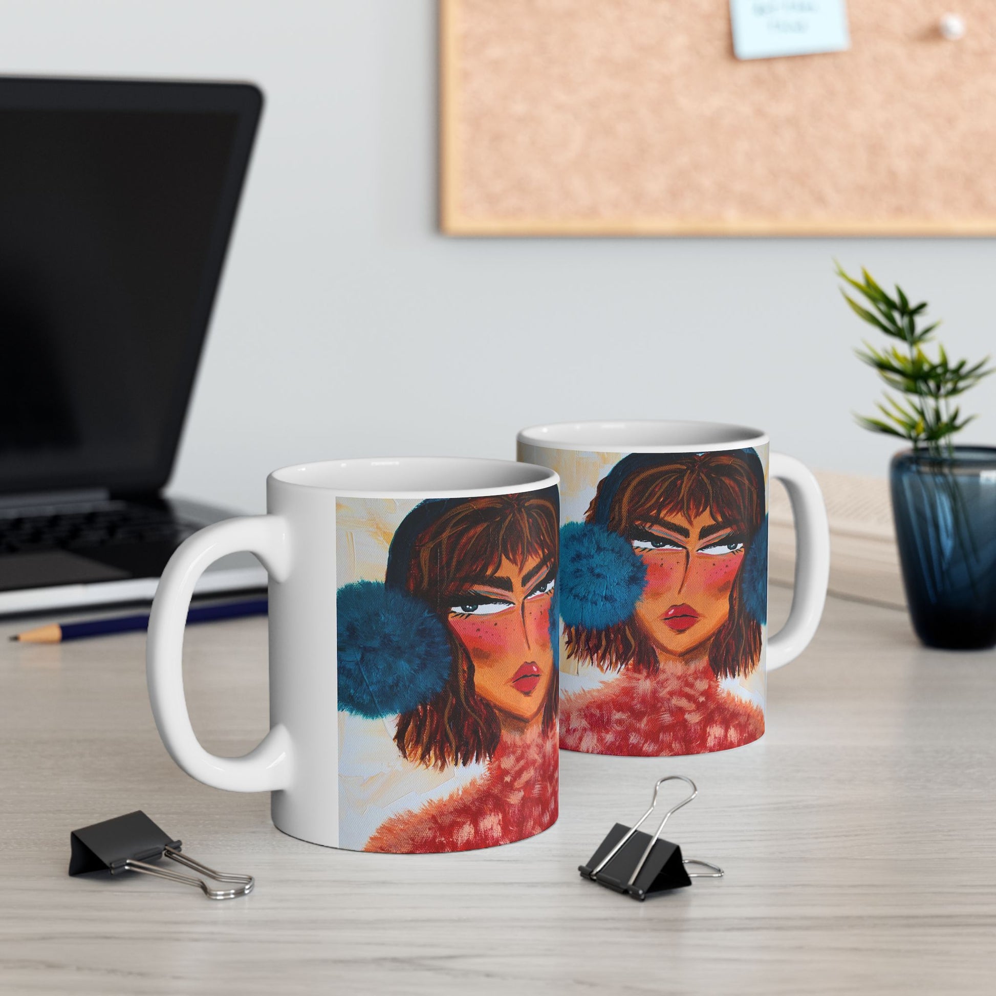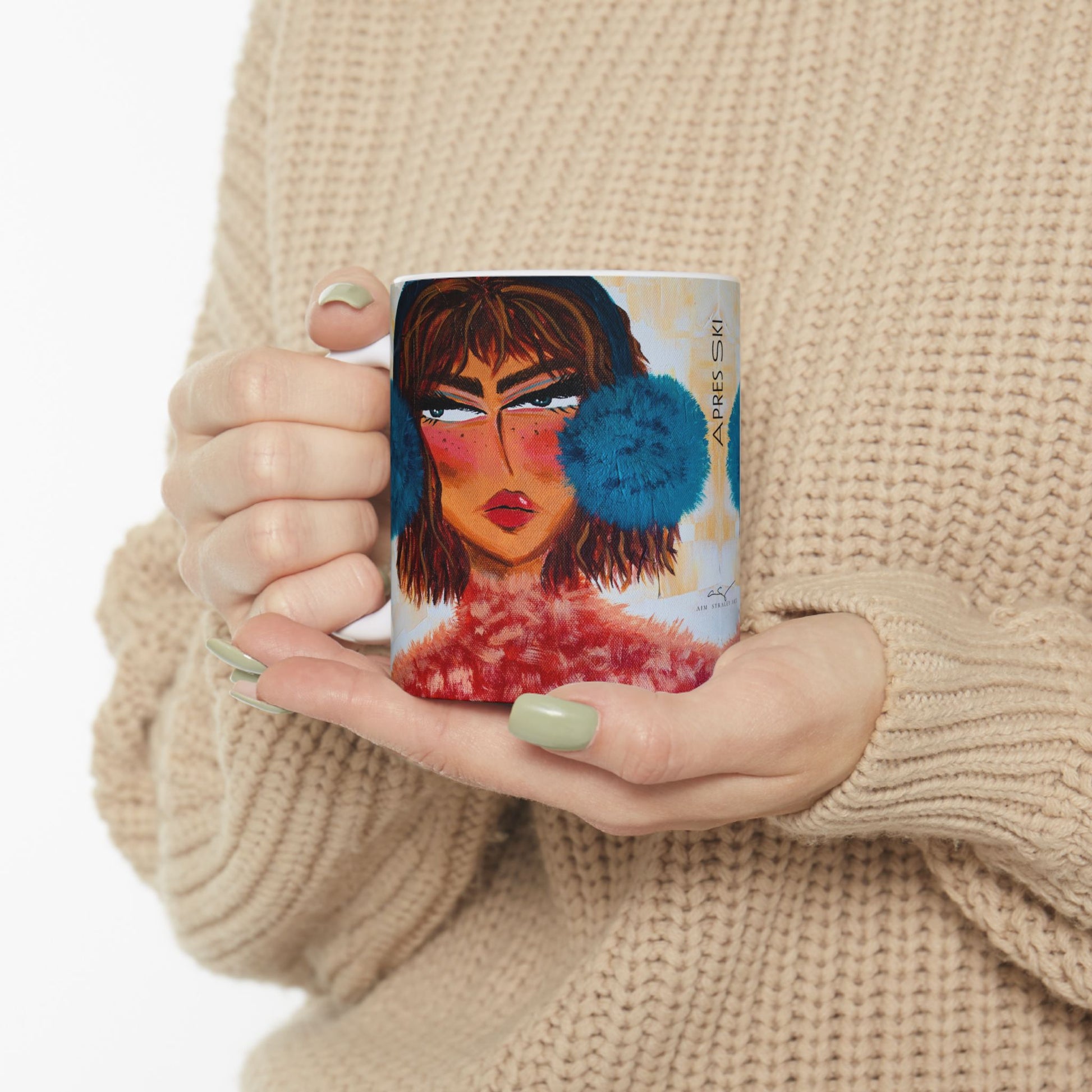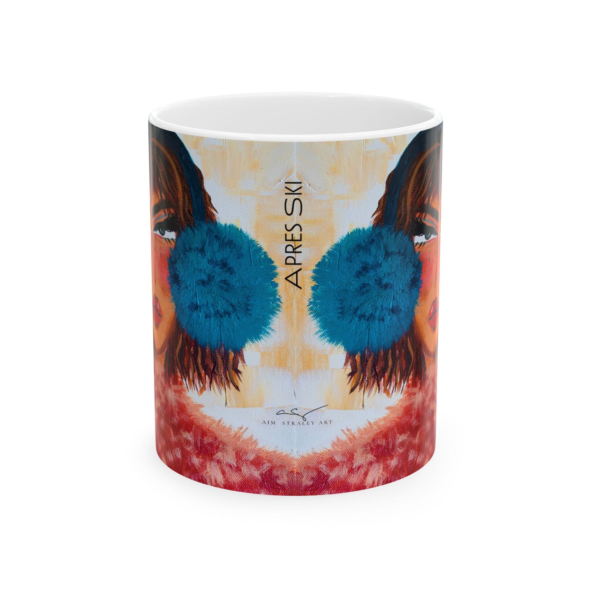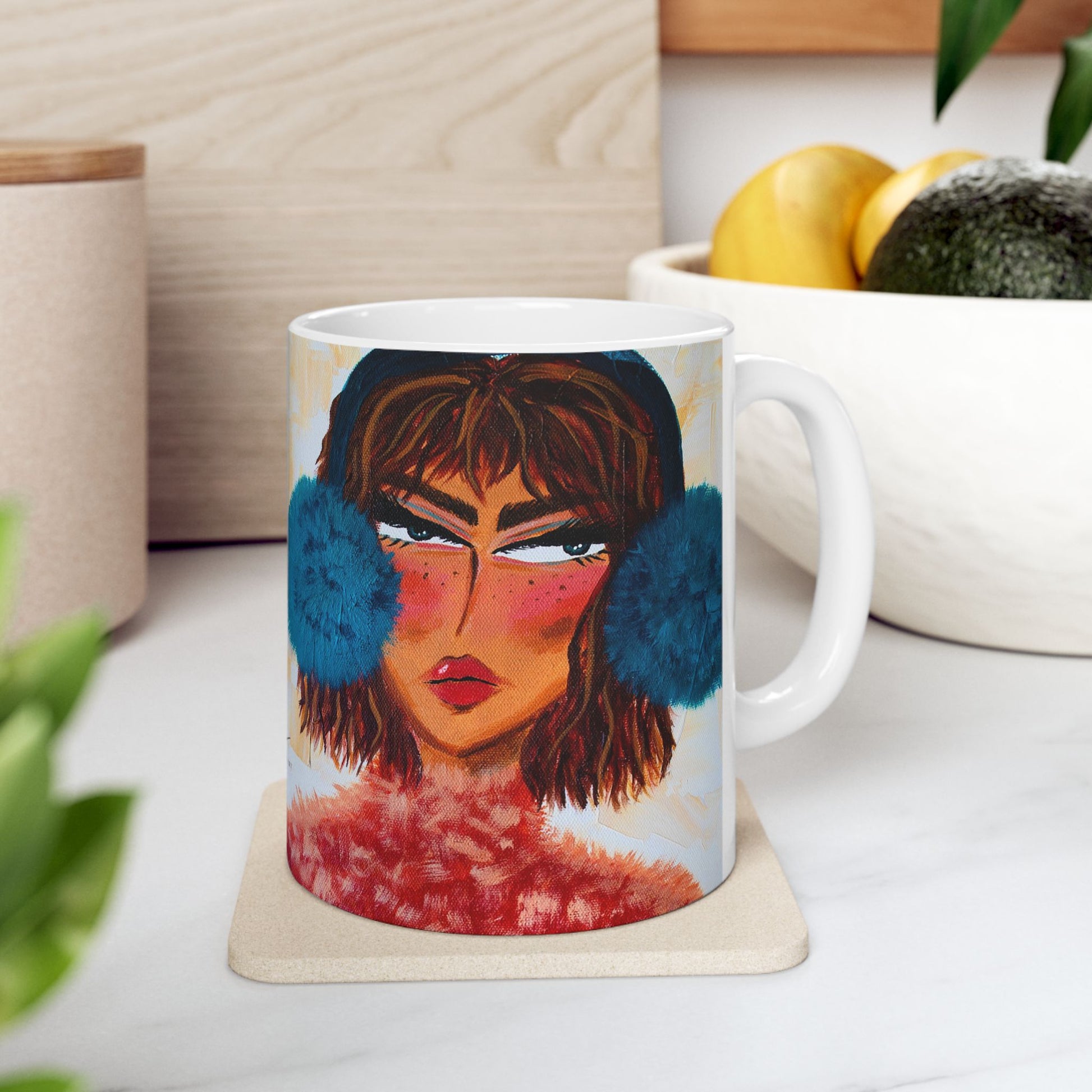 This 11oz coffee mug is printed with my original artwork "Apres Ski" with a white interior and handle. This cute fashion illustration makes a great winter gift! Featuring a woman wearing teal blue fuzzy earmuffs and a soft coral sweater.