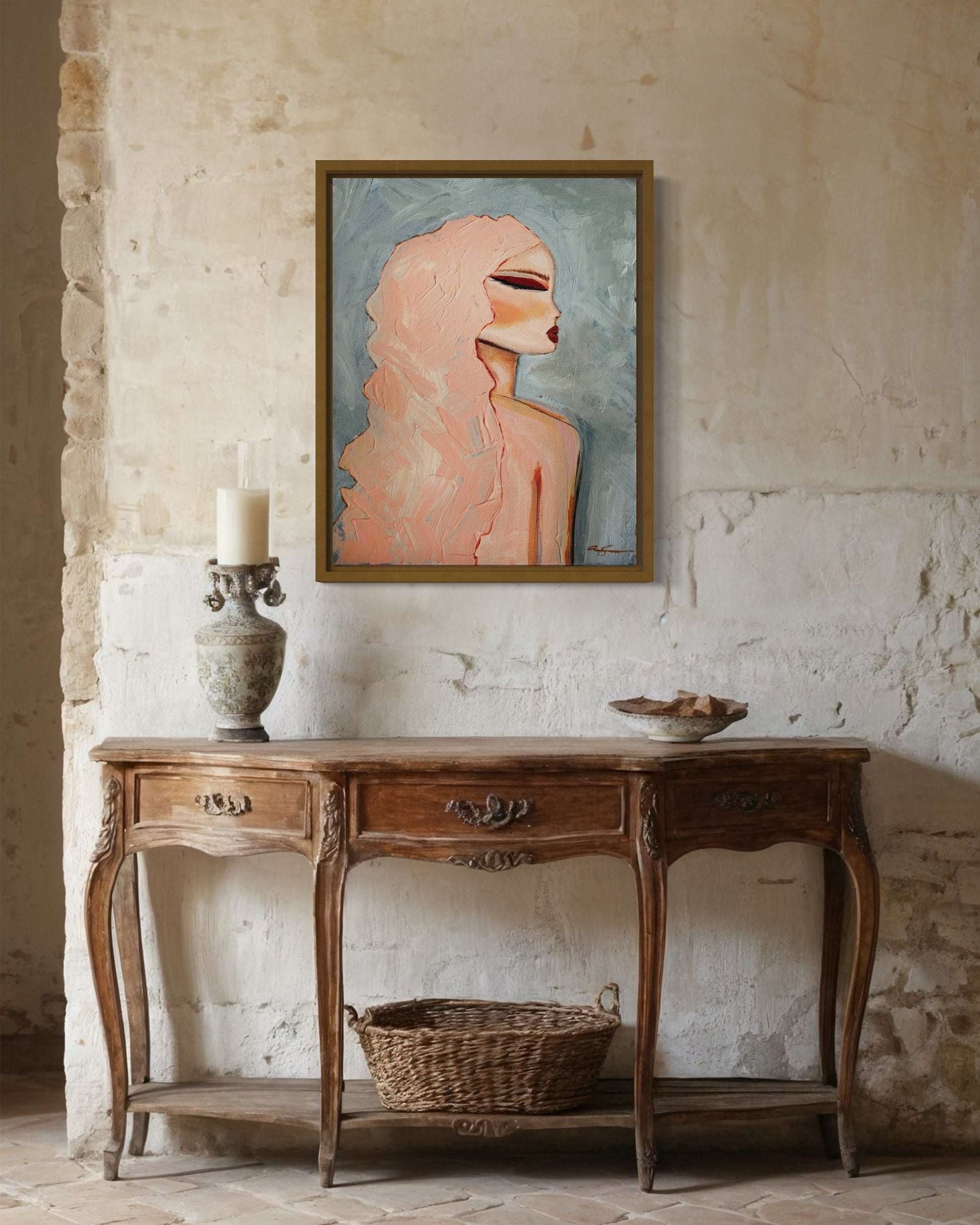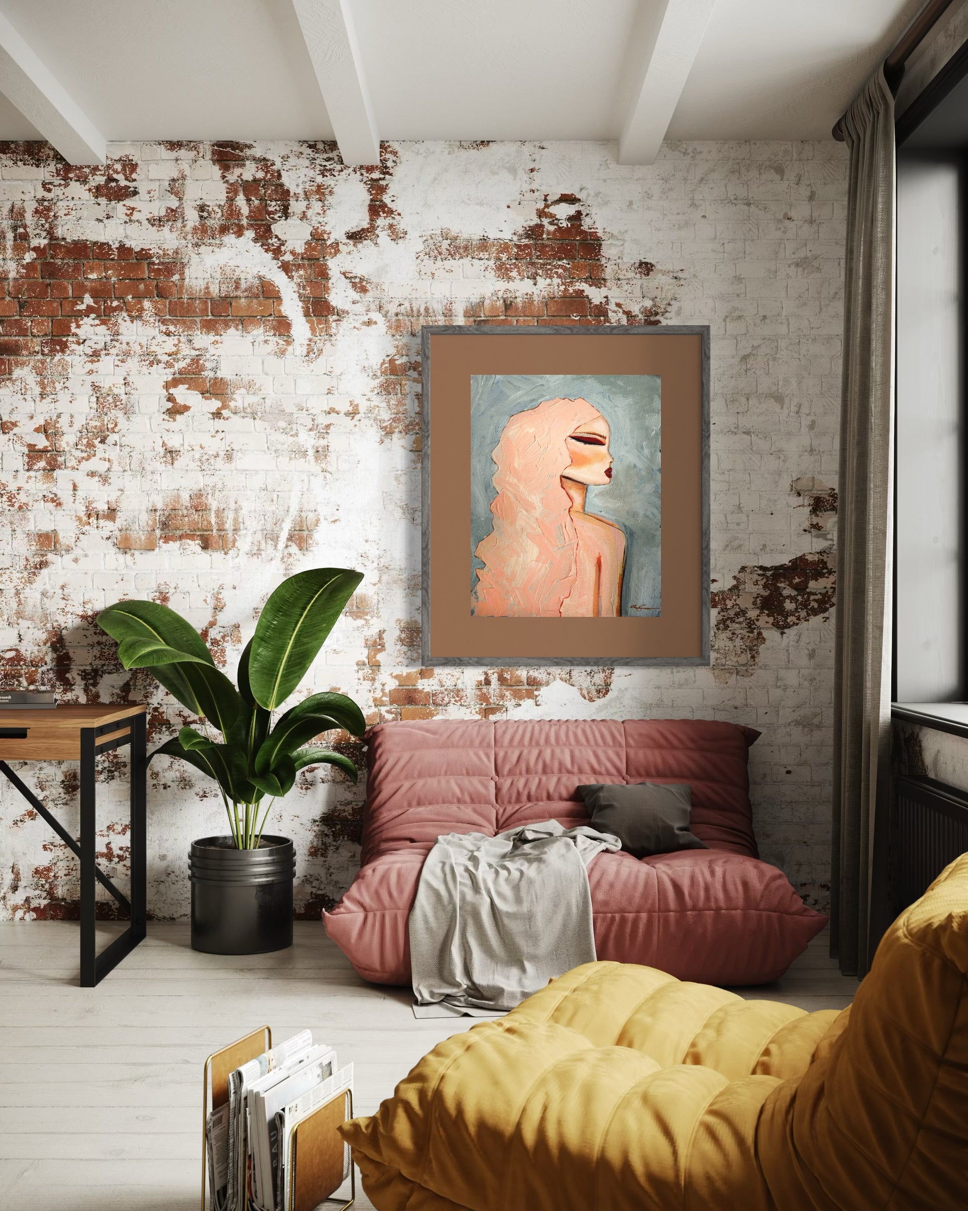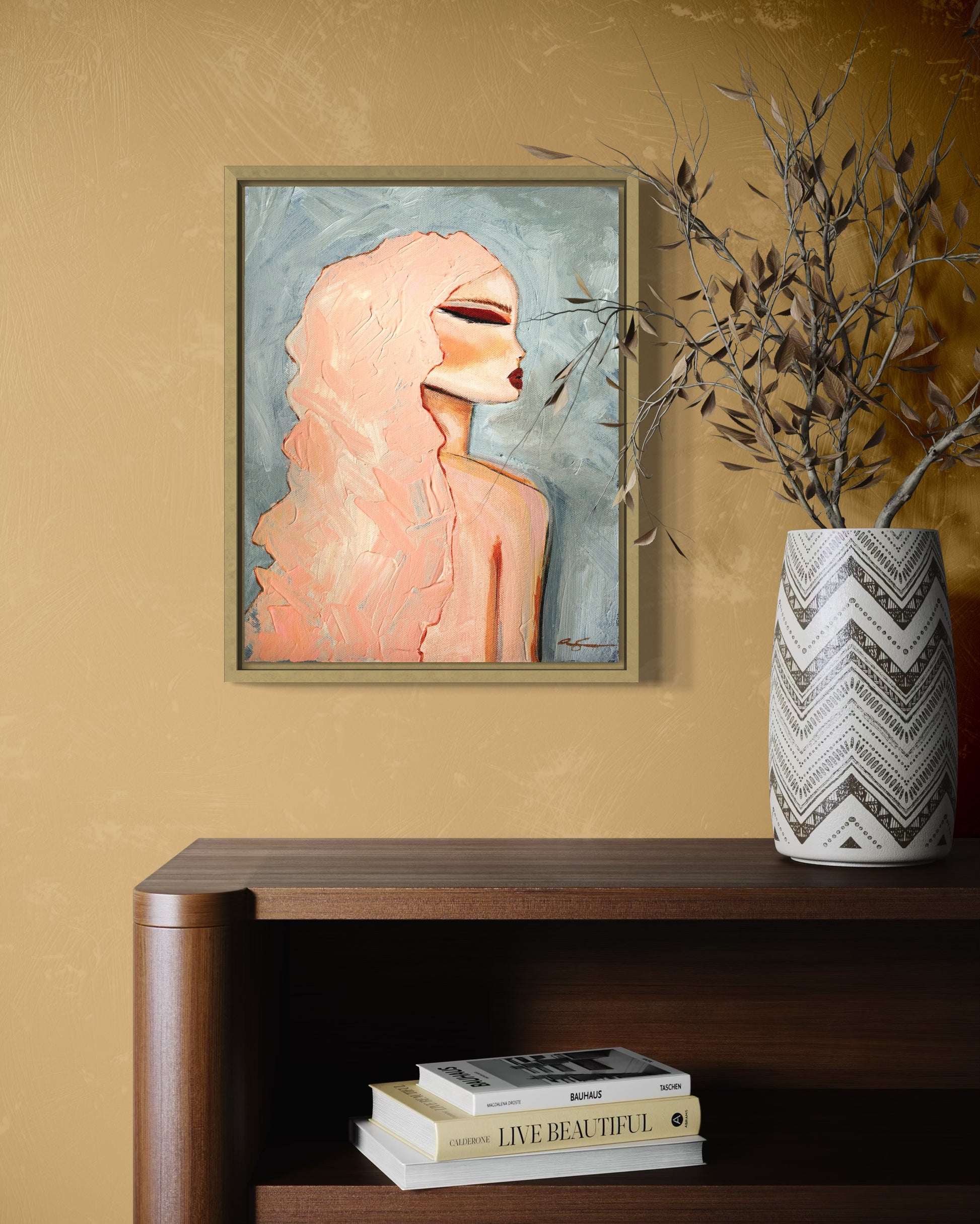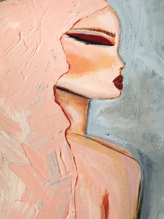 "Aria.” She’s beautiful muted blues and pinks with a bold burgundy eyeshadow and lip. Peaceful and serene, a perfect piece for a gallery wall or as a larger statement print.