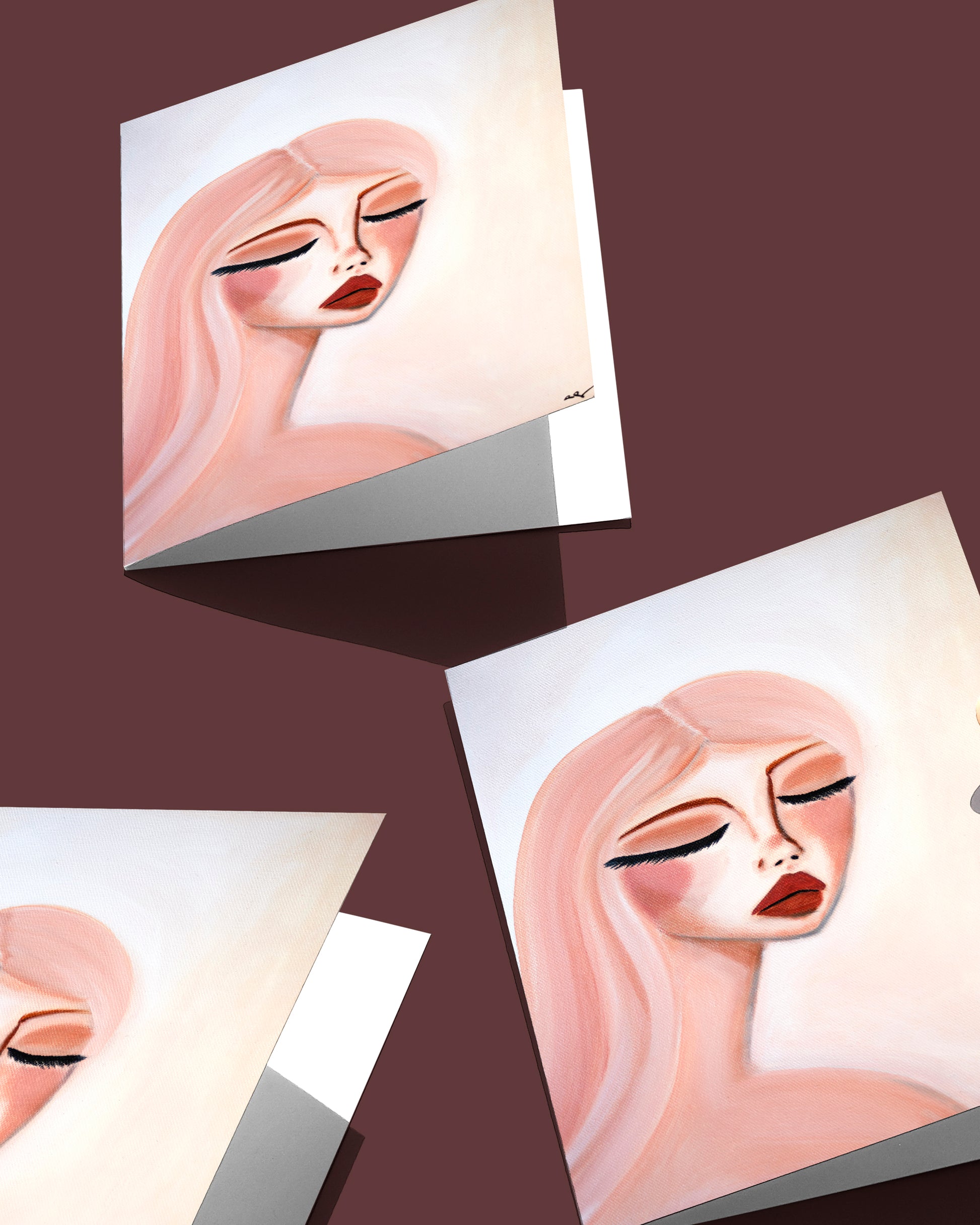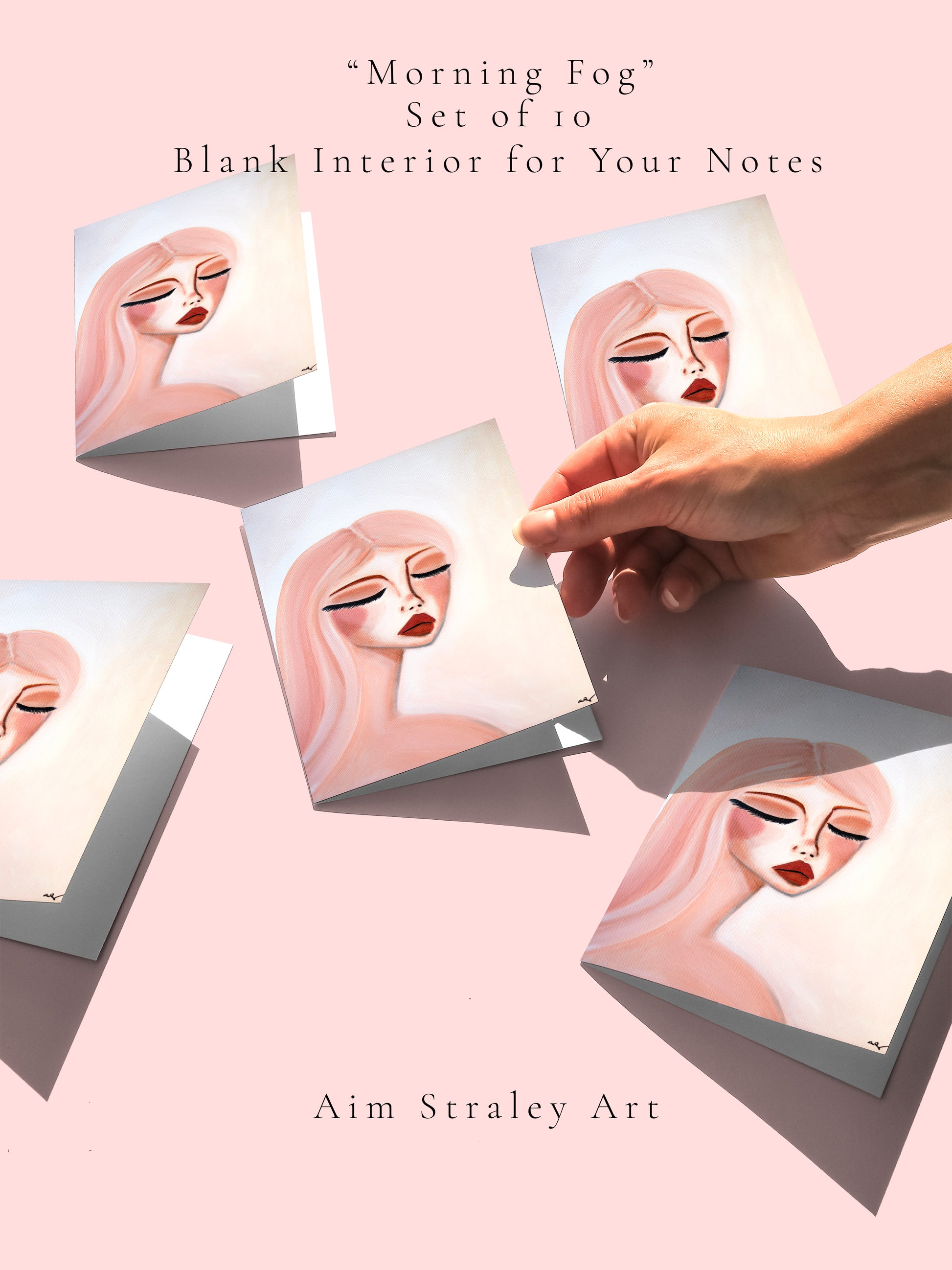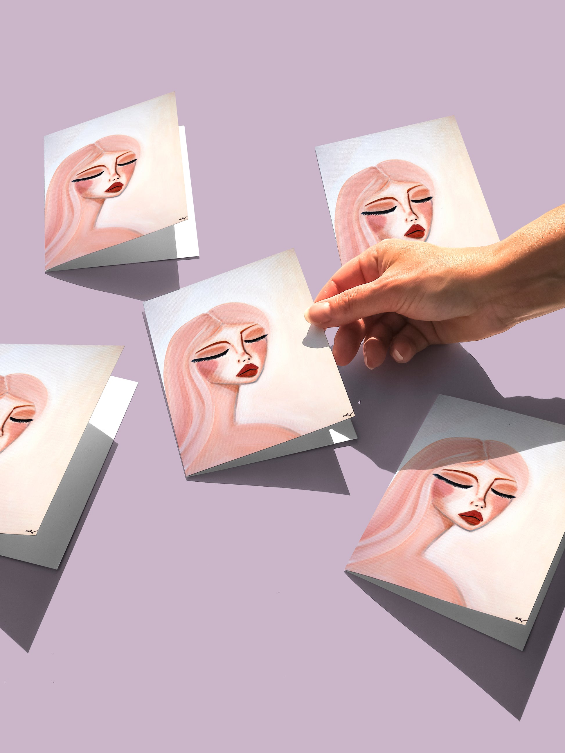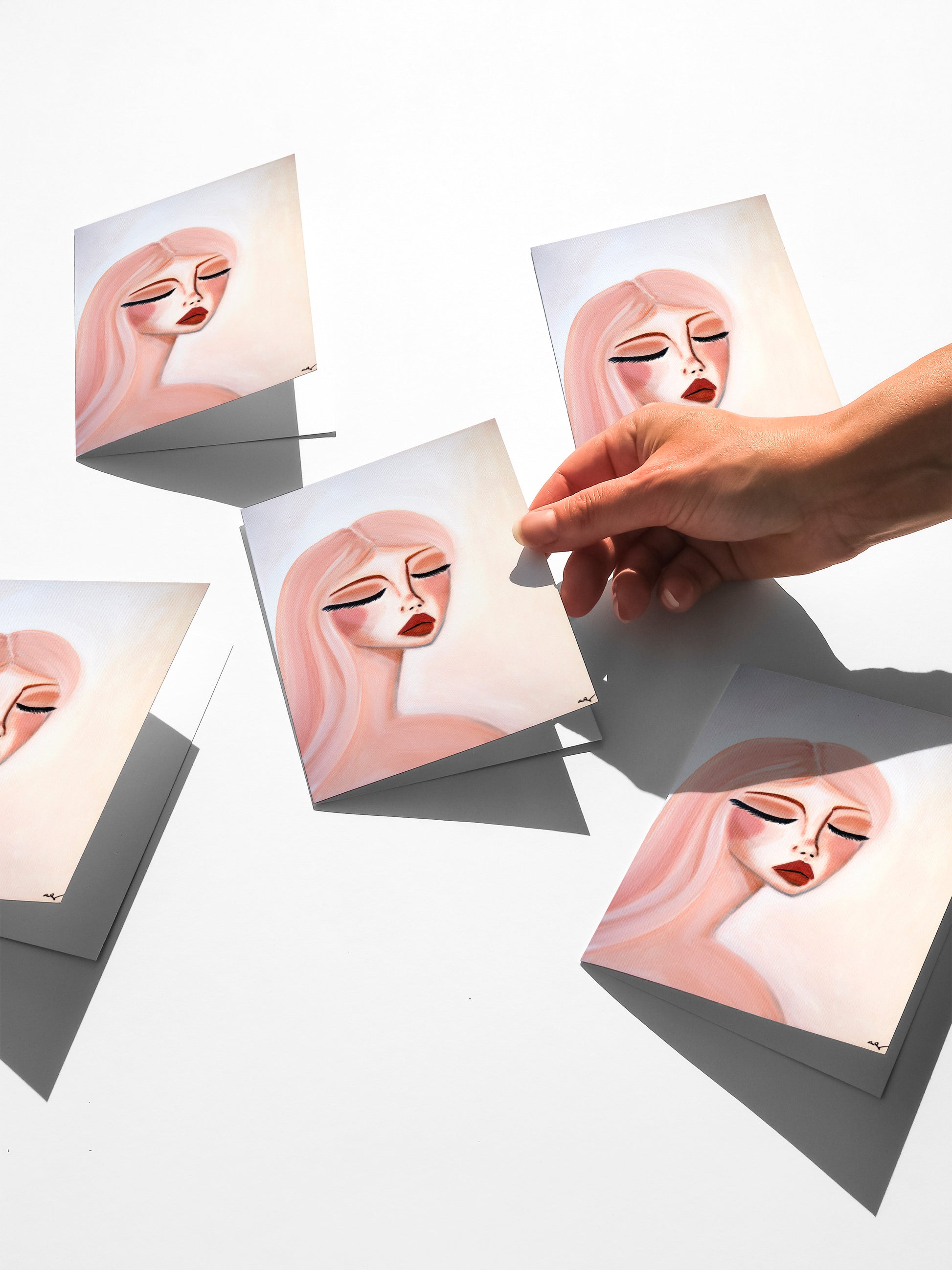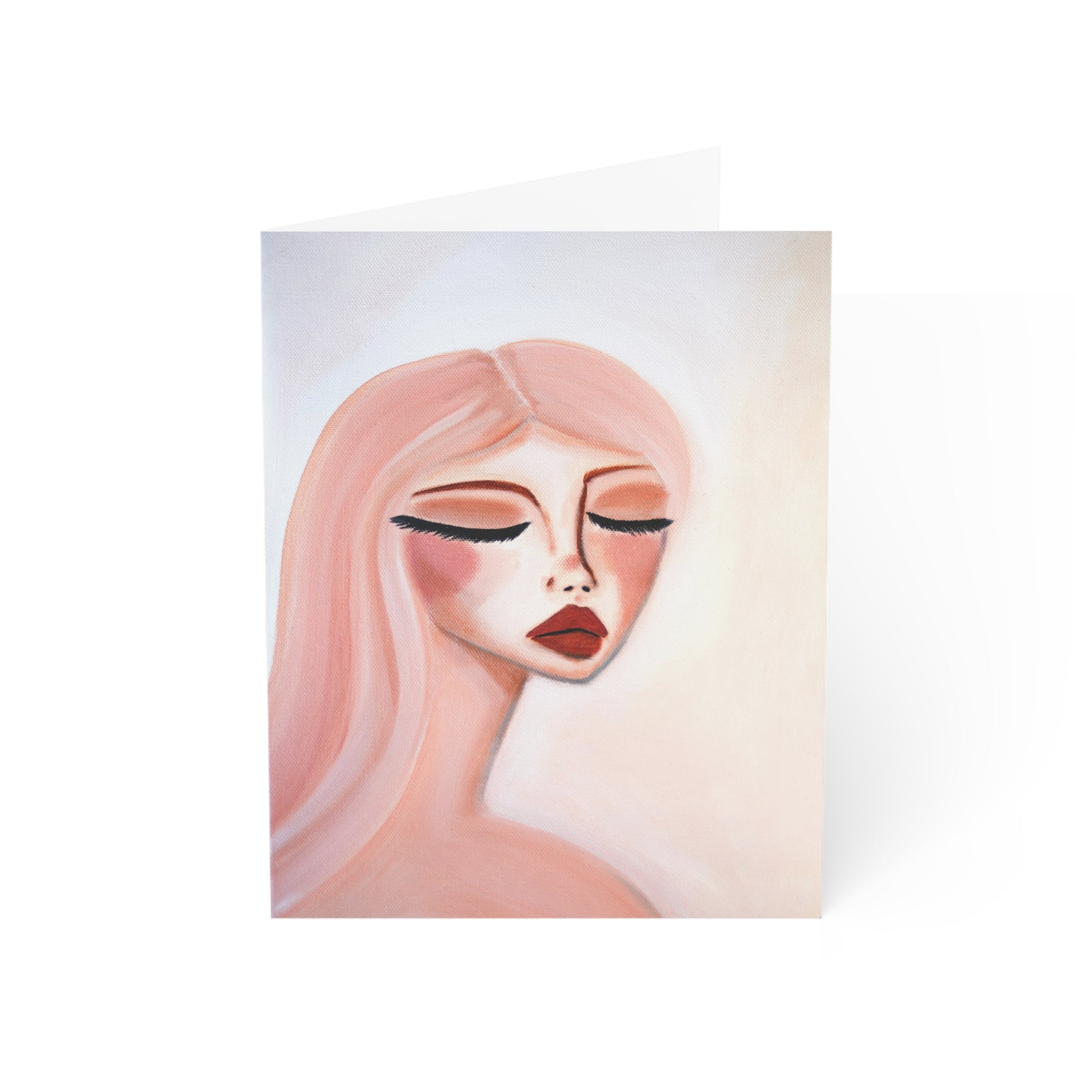 This set of 10 greeting cards features my artwork of a peaceful, dreamy soft pink toned girl with pink hair and a white background. These notecards are blank on the inside making them perfect or every occasion or celebration. Each card is printed with vibrant colors, making your note a special and unique gift.