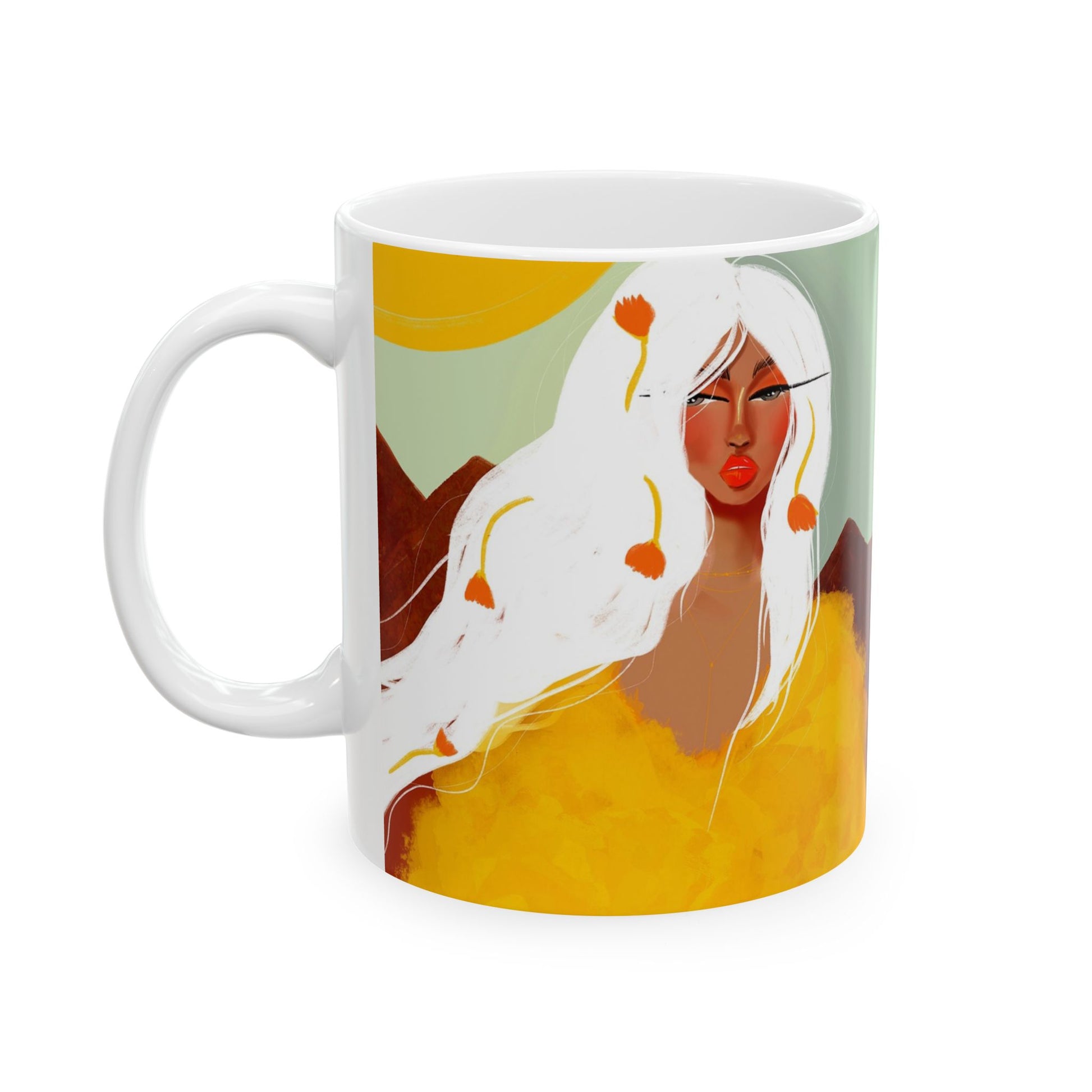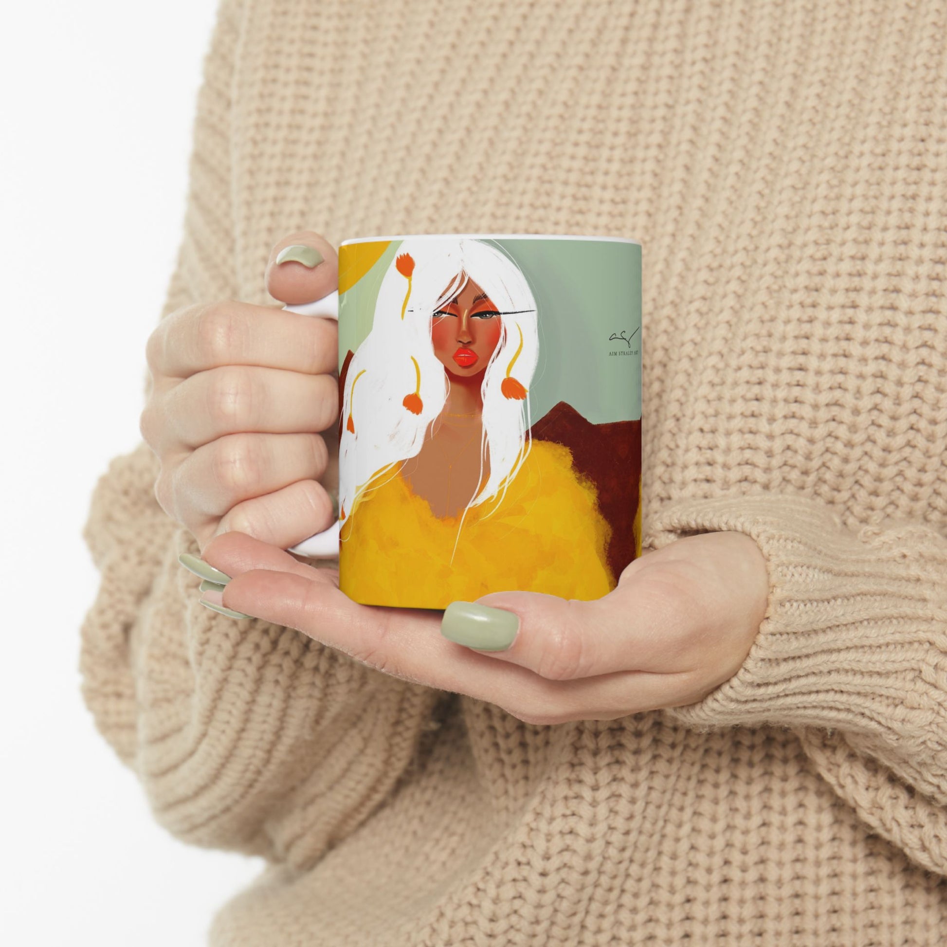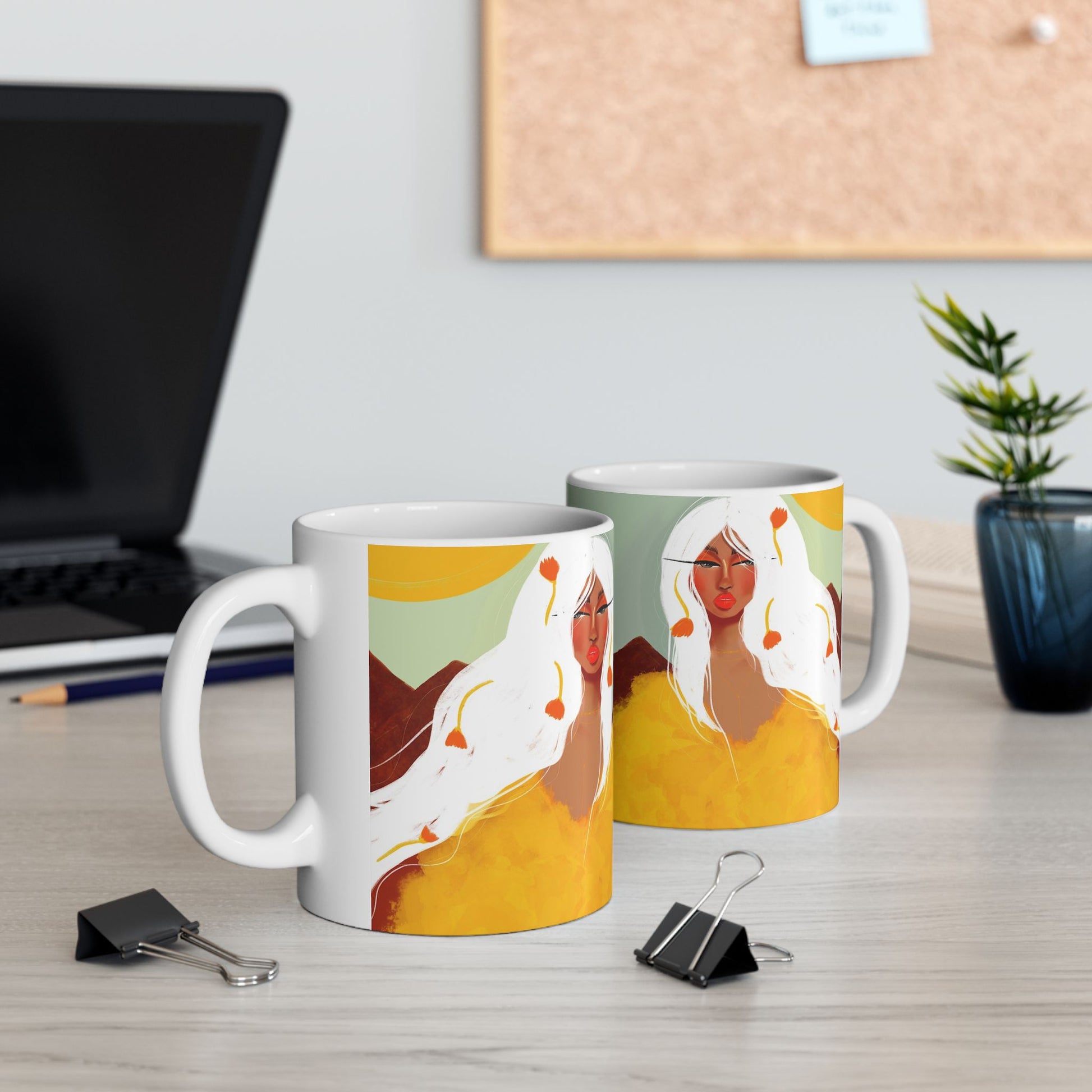This mug is perfect for the art and coffee lover in your life. Printed with my hand drawn digital artwork, "Golden July. Featuring a woman with California poppy flowers in her long flowing white hair. Her dress is a bright golden yellow and really pops in the desert mountain scene background. Perfect for any fashion illustration lover, boho travel girl, or just to brighten up a girly kitchen!