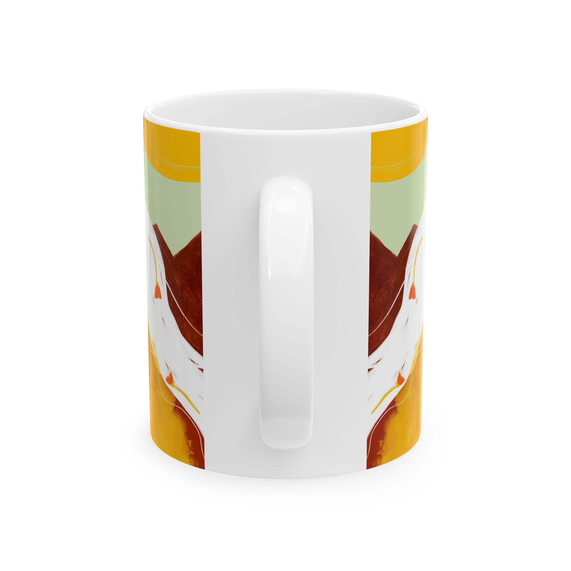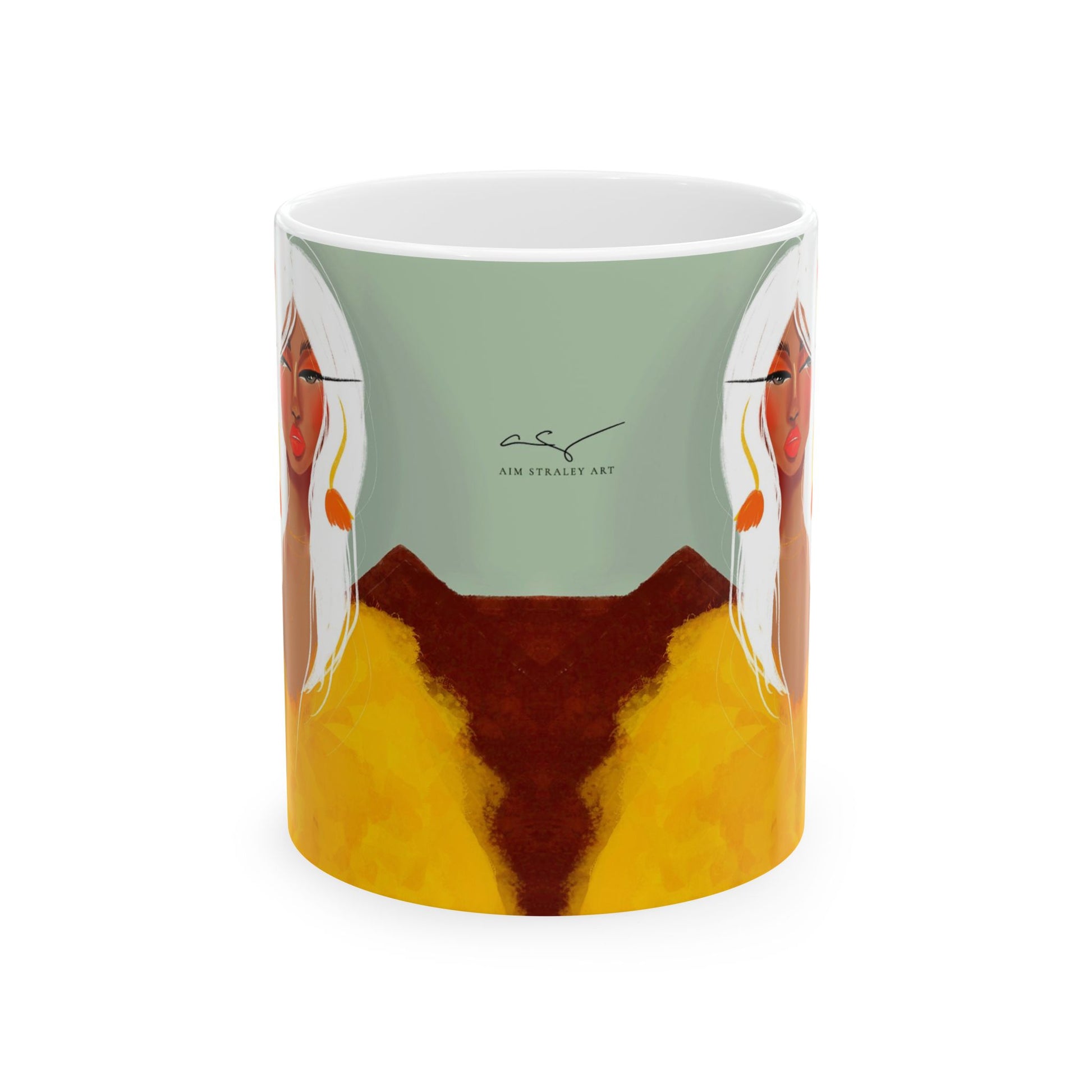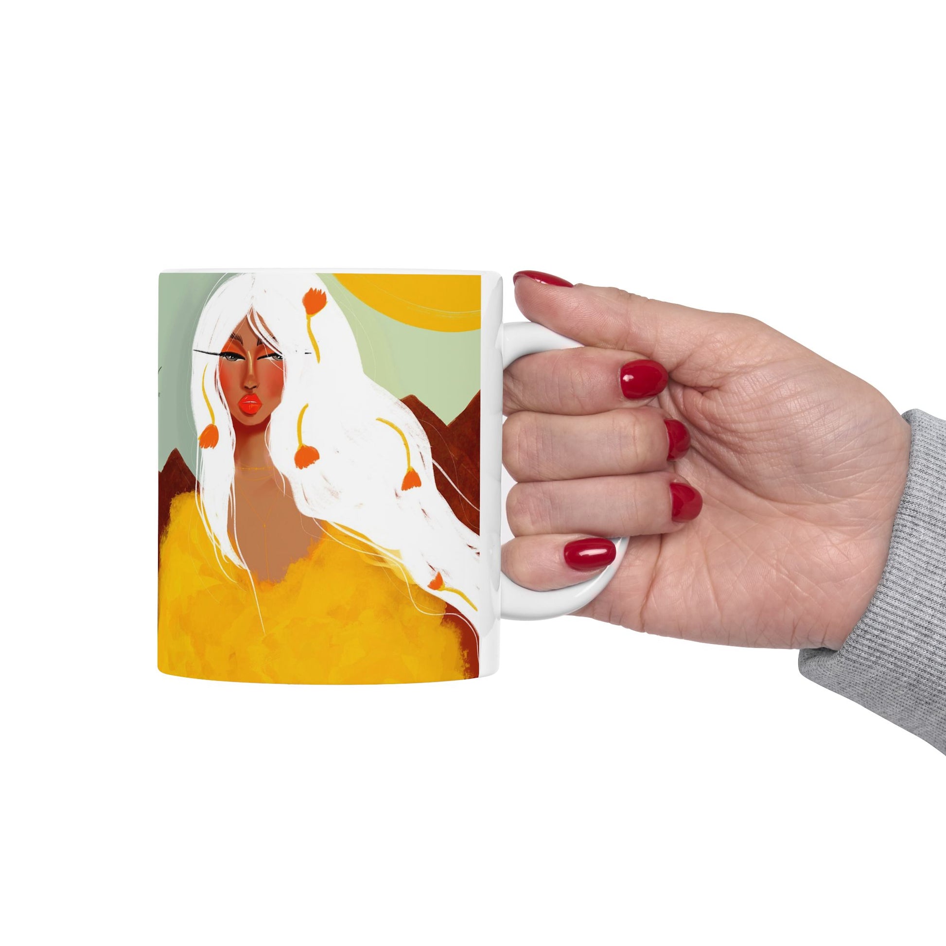 This mug is perfect for the art and coffee lover in your life. Printed with my hand drawn digital artwork, "Golden July. Featuring a woman with California poppy flowers in her long flowing white hair. Her dress is a bright golden yellow and really pops in the desert mountain scene background. Perfect for any fashion illustration lover, boho travel girl, or just to brighten up a girly kitchen!
