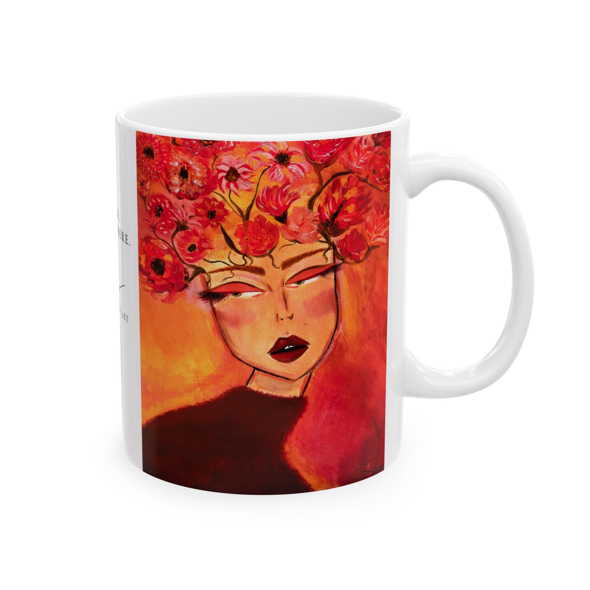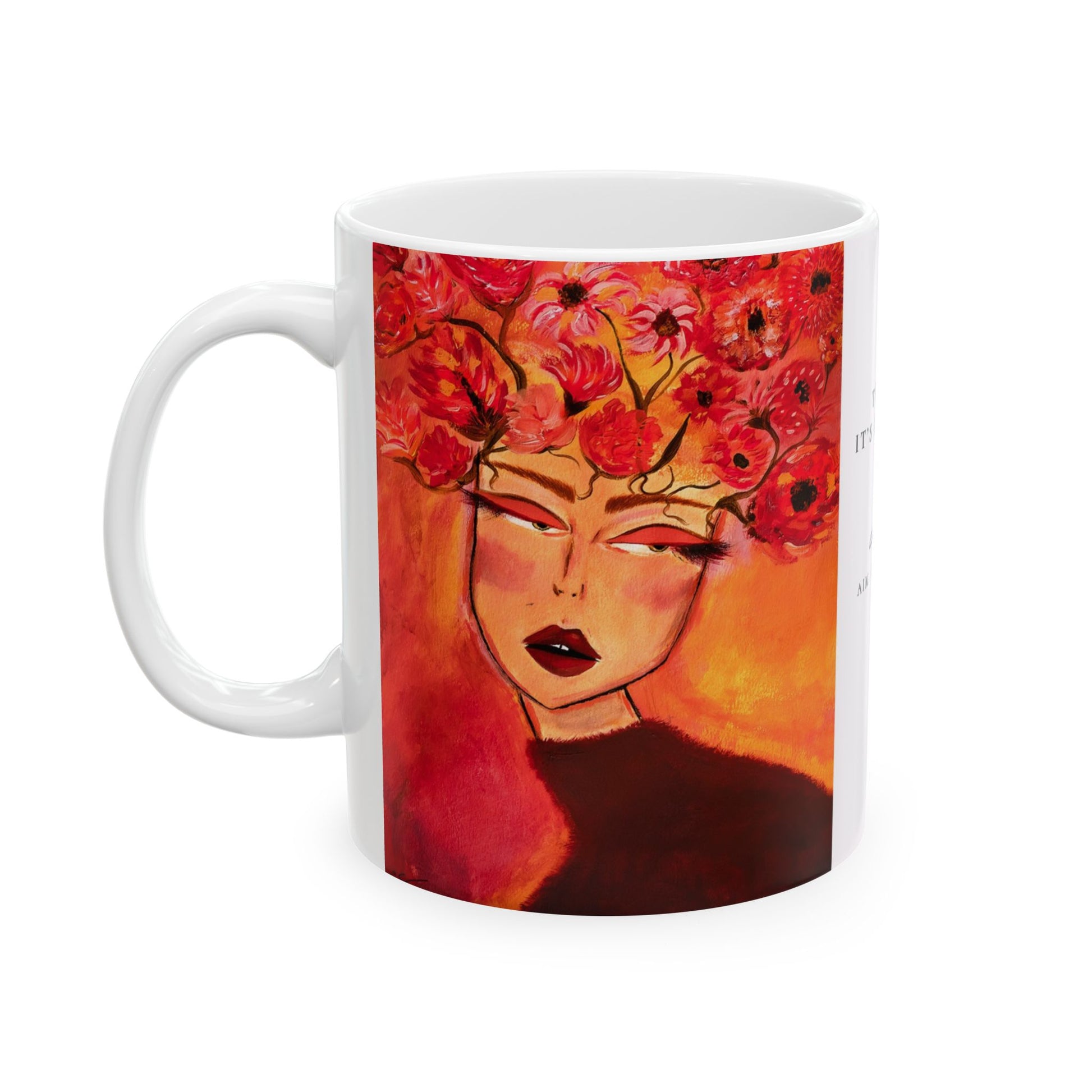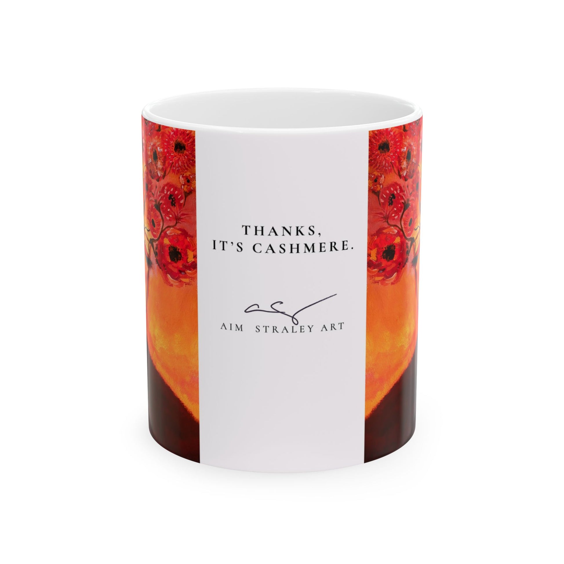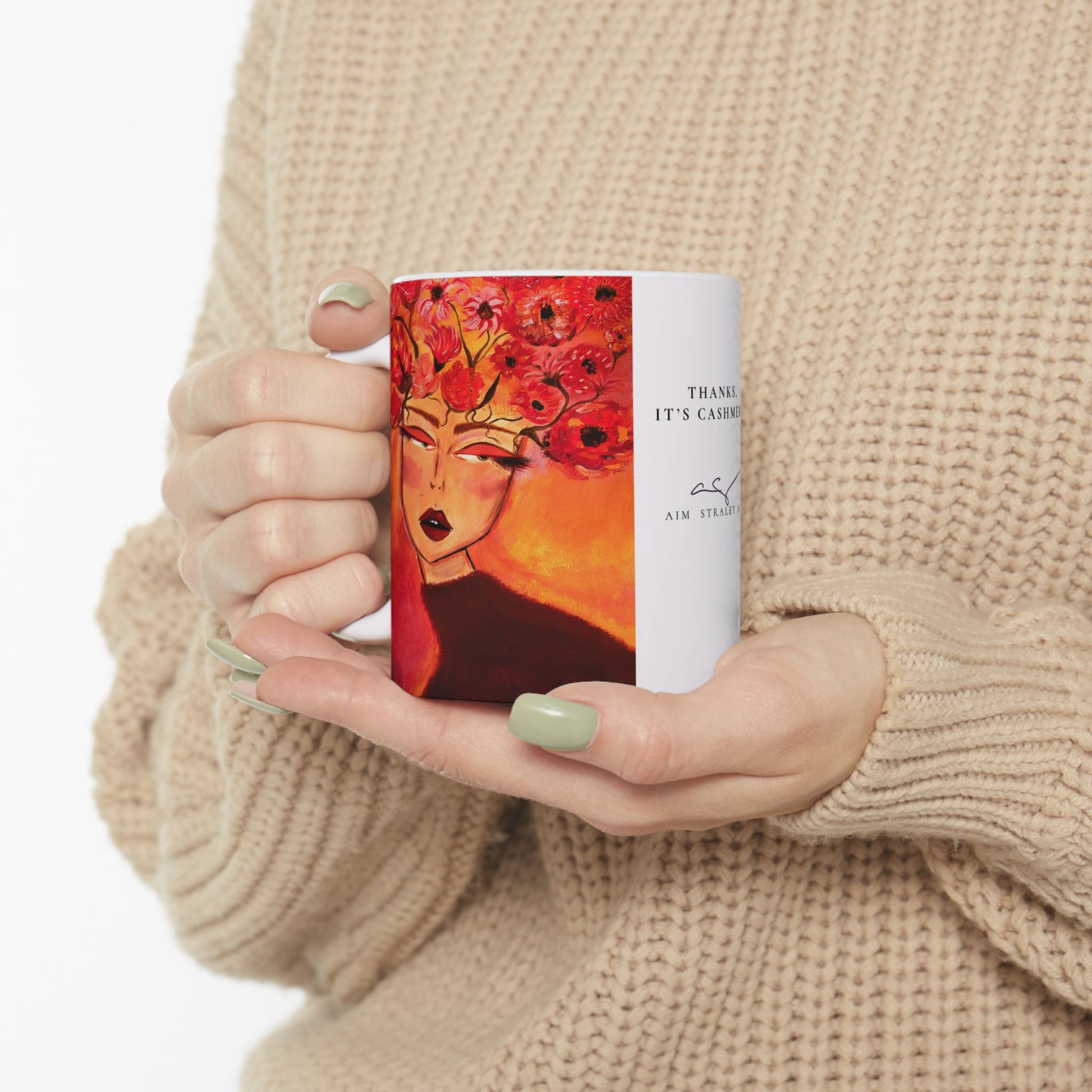 This 11oz coffee mug features my original artwork, "Thanks, It's Cashmere." She's a beautiful, bright, fashion statement with pink and orange flowers growing out of her head. A perfect gift for a fashion lover, a creative, or just as a great way to brighten up a girly kitchen.