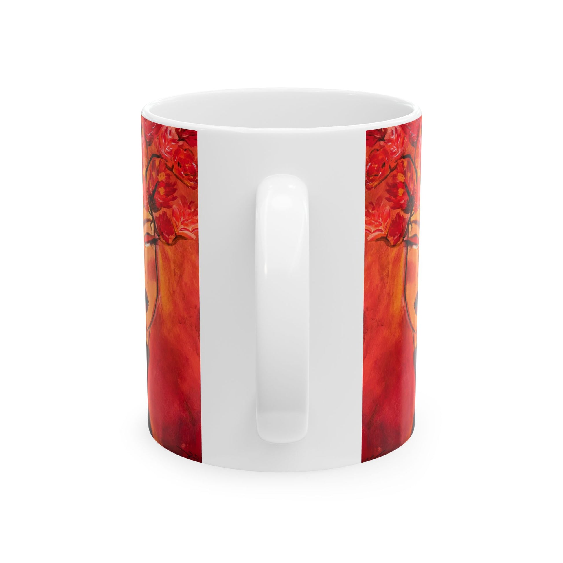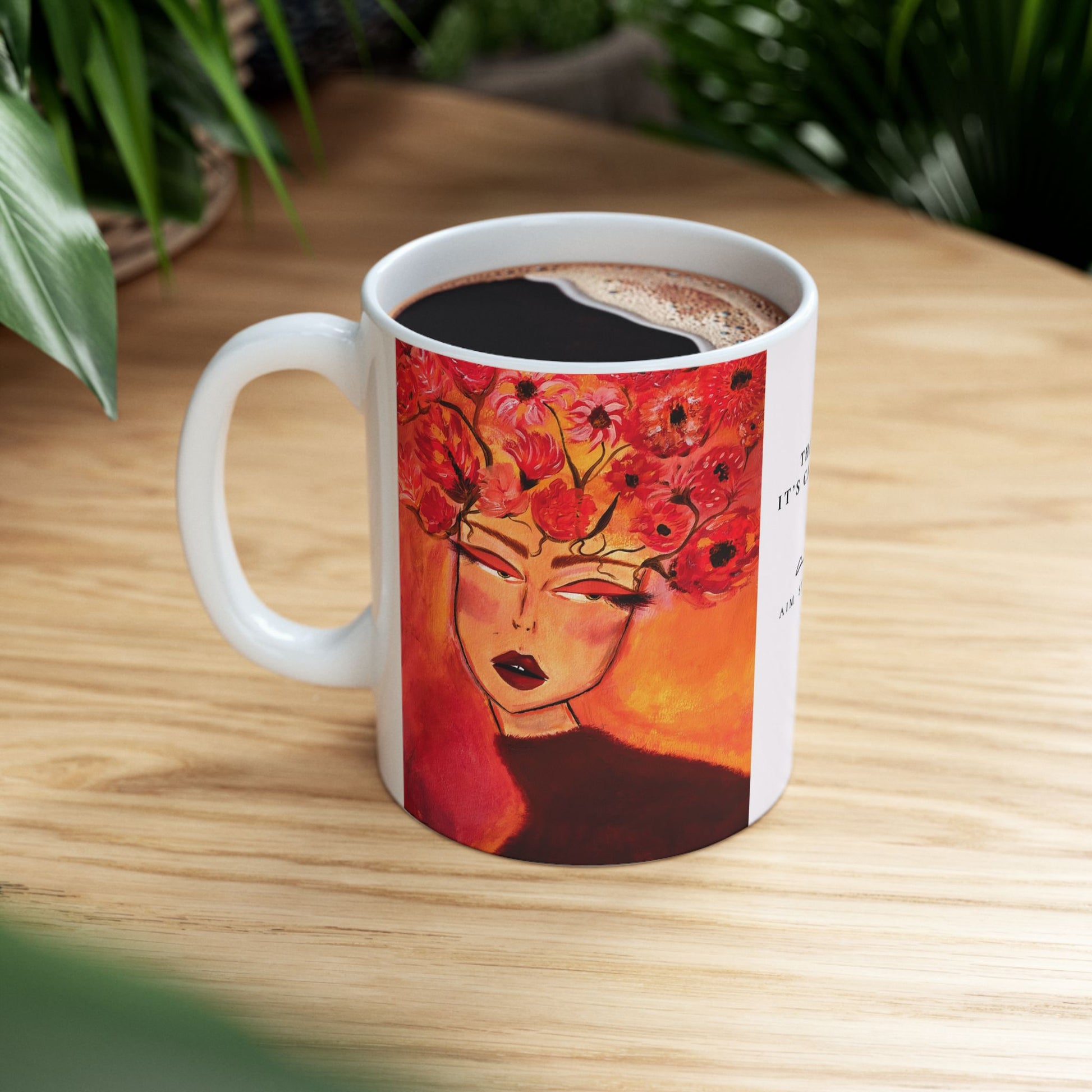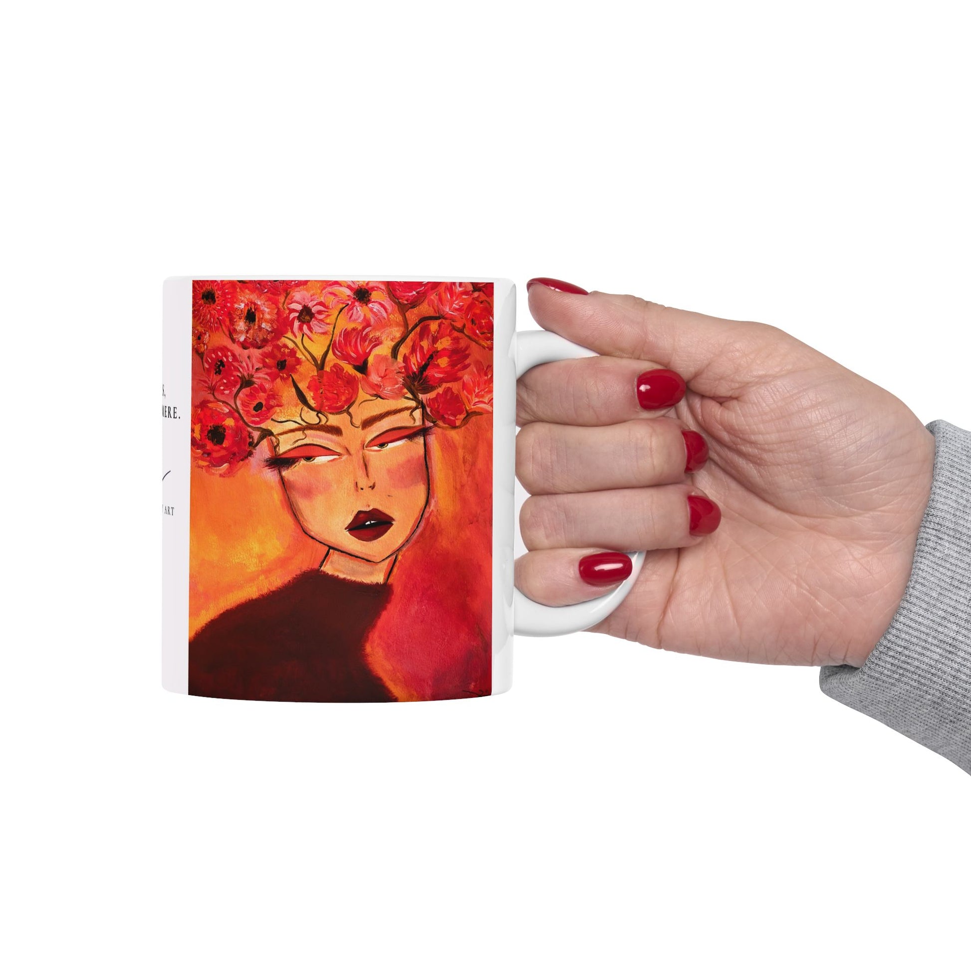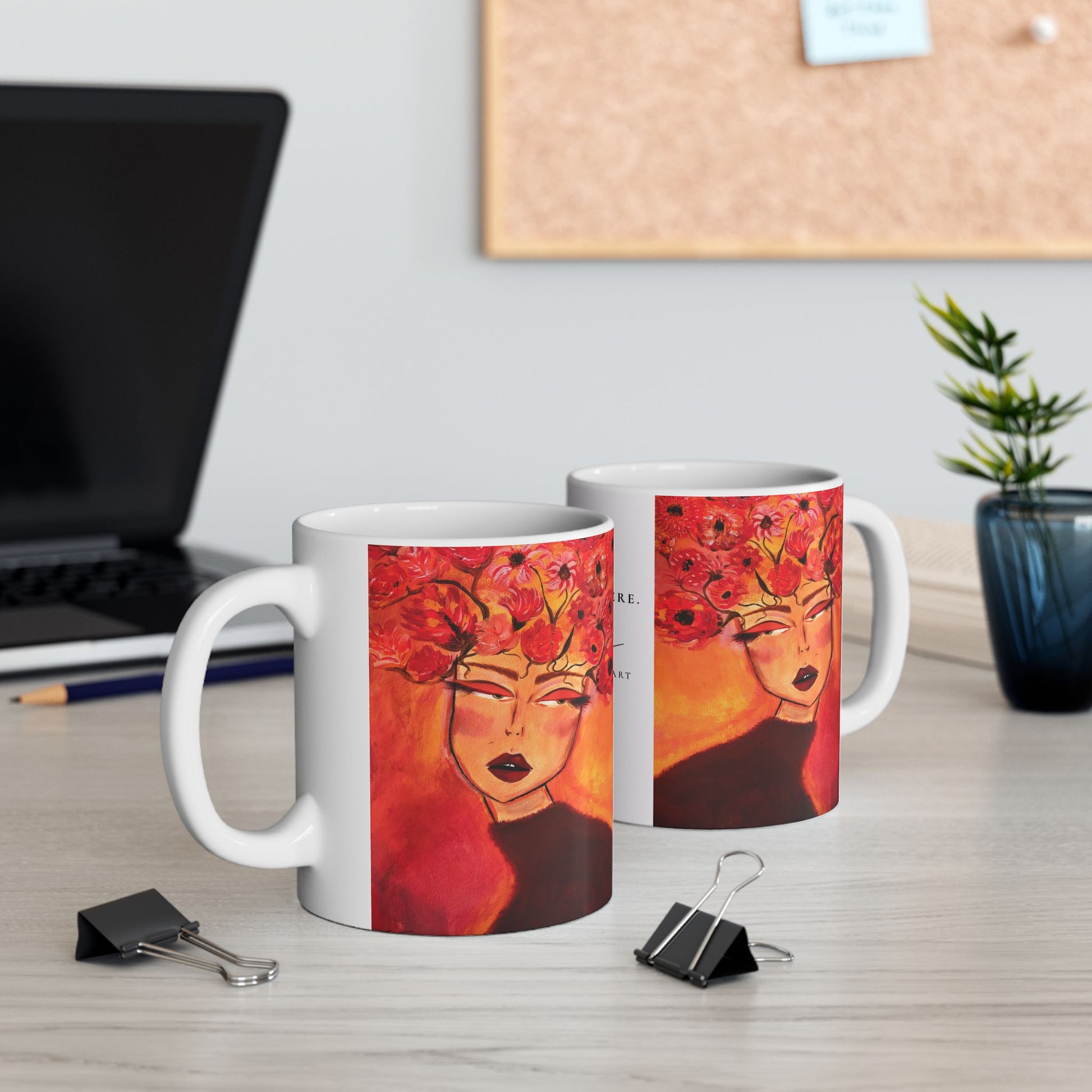 This 11oz coffee mug features my original artwork, "Thanks, It's Cashmere." She's a beautiful, bright, fashion statement with pink and orange flowers growing out of her head. A perfect gift for a fashion lover, a creative, or just as a great way to brighten up a girly kitchen.