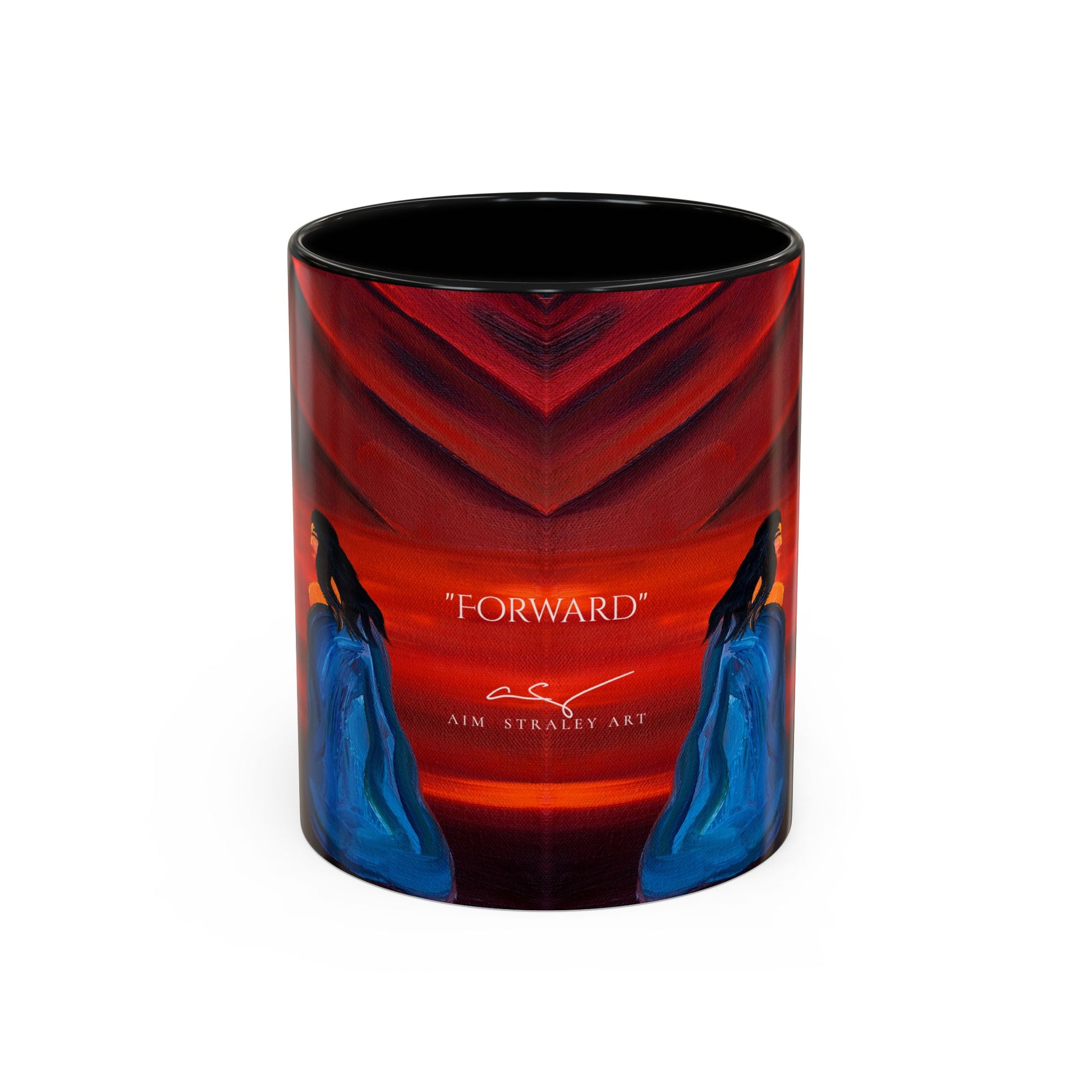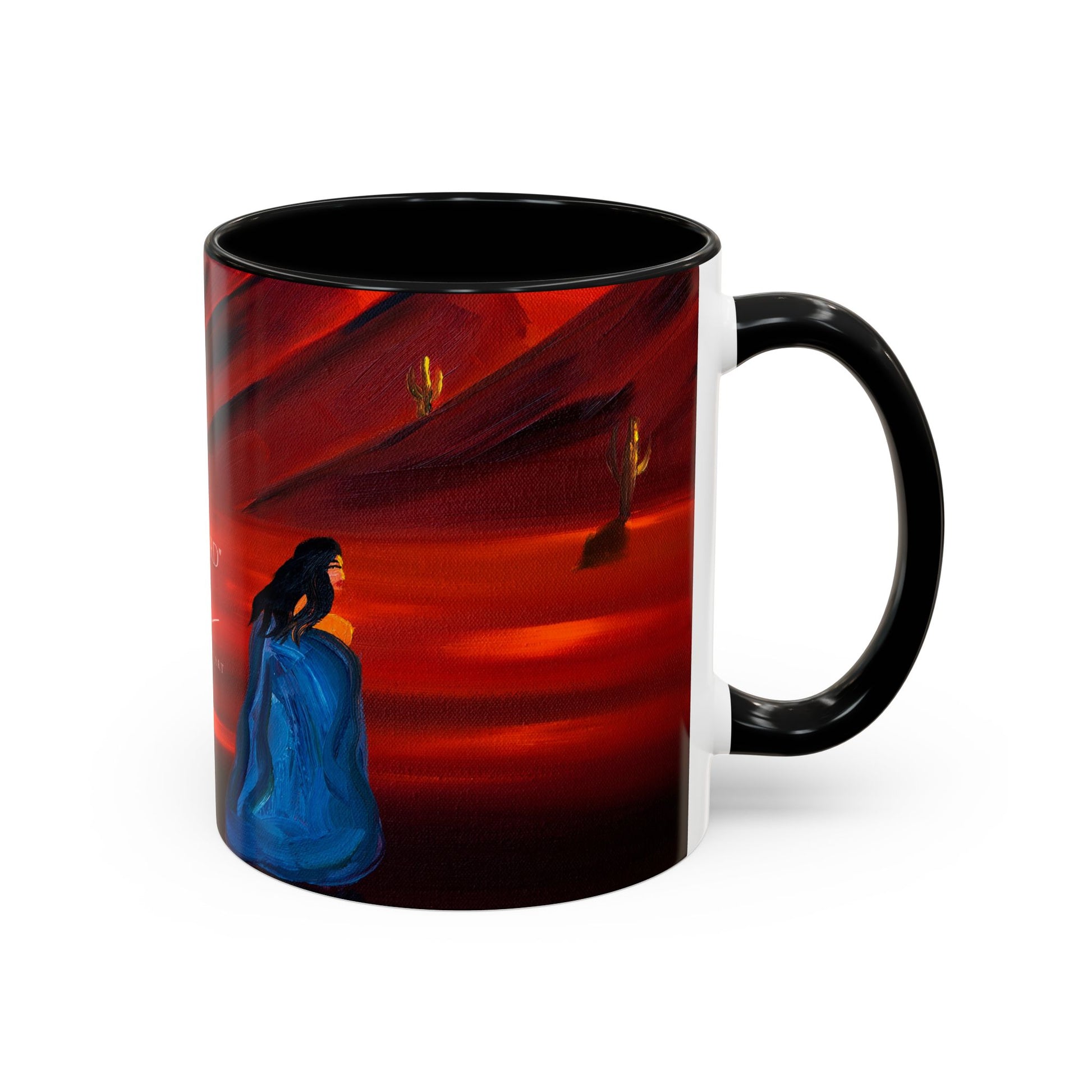 This mug is perfect for the art and coffee lover in your life. Printed with my one of a kind artwork "Forward." Featuring a woman traveling through a red desert landscape with cactus in the background. Her flowing dress is a bright blue, which really pops on the red desert. This mug makes a beautiful inspirational gift.