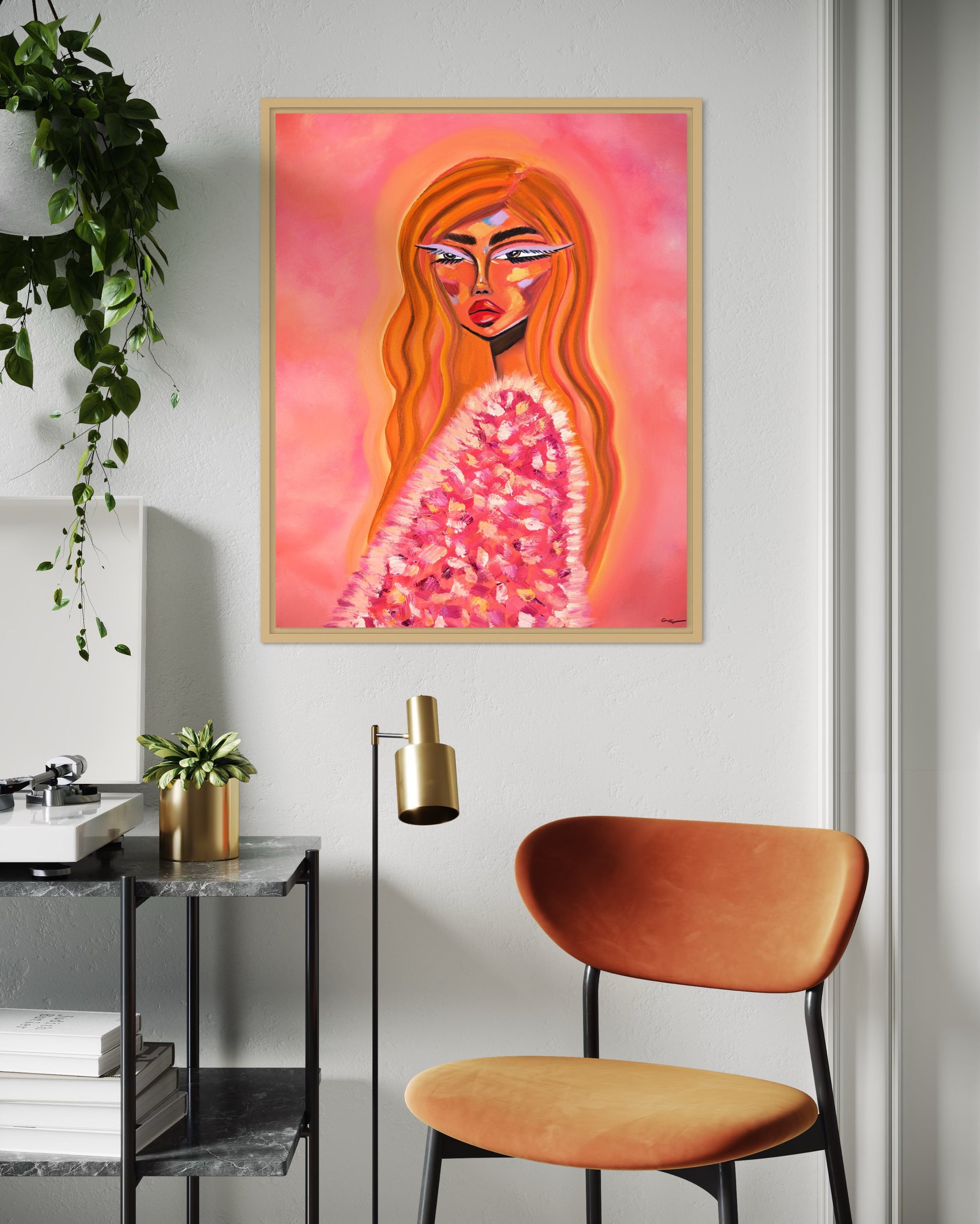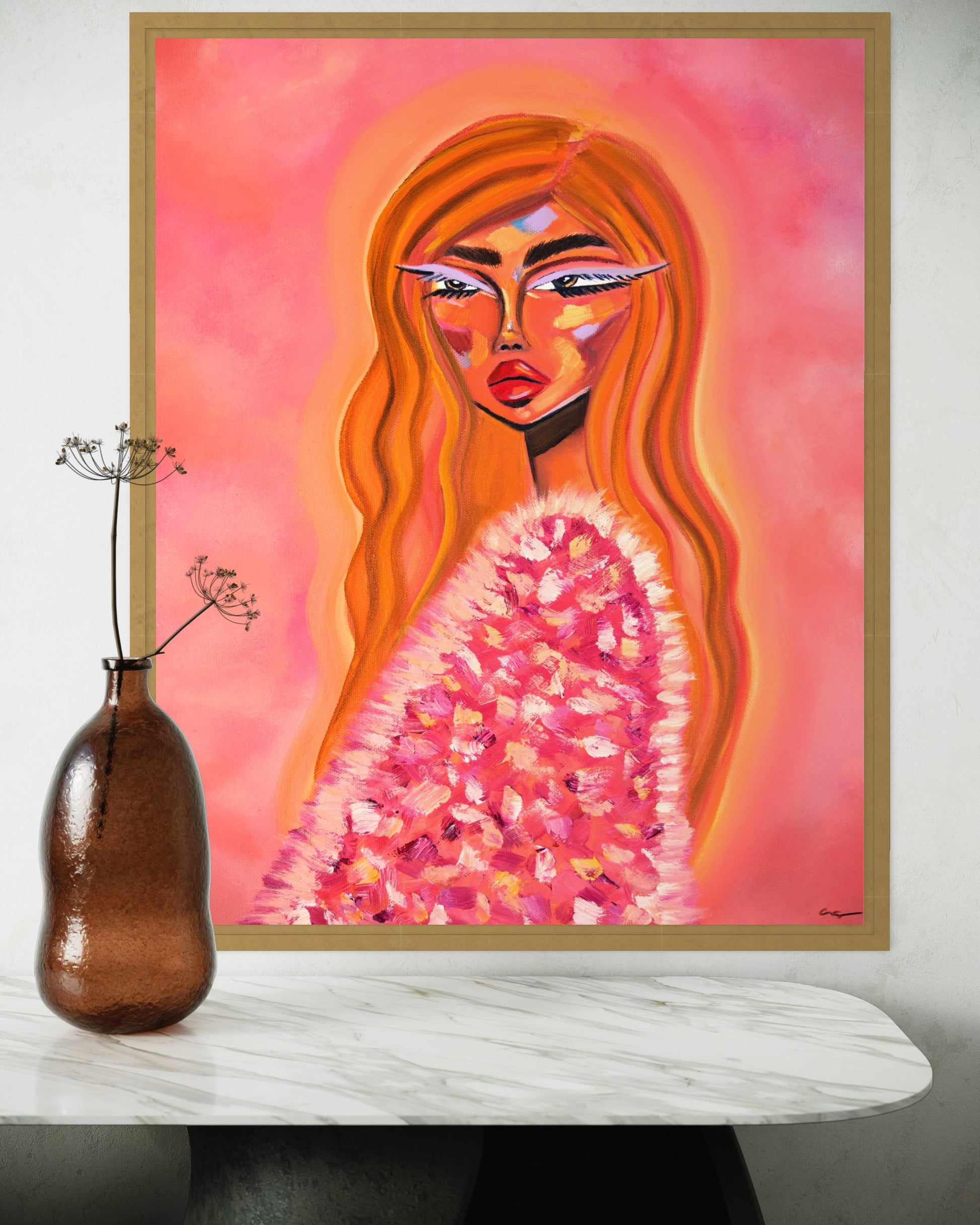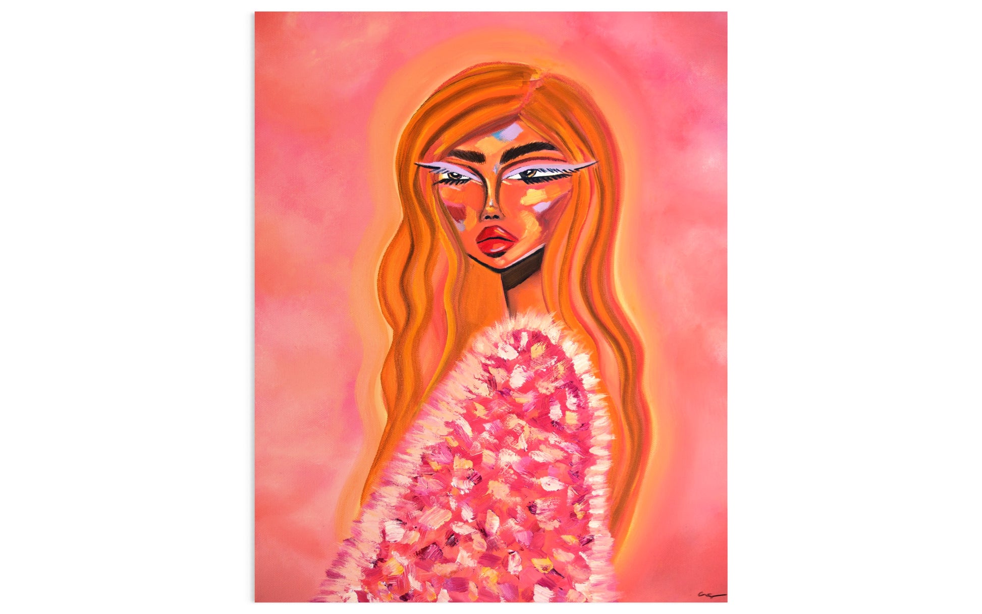 How Do You Like Your Cosmo?" is living in a cotton candy winter. Her fuzzy sweater is cozy and glam paired with lavender eyeliner. A warm sherbet orange glow around her radiates warmth and sweetness.