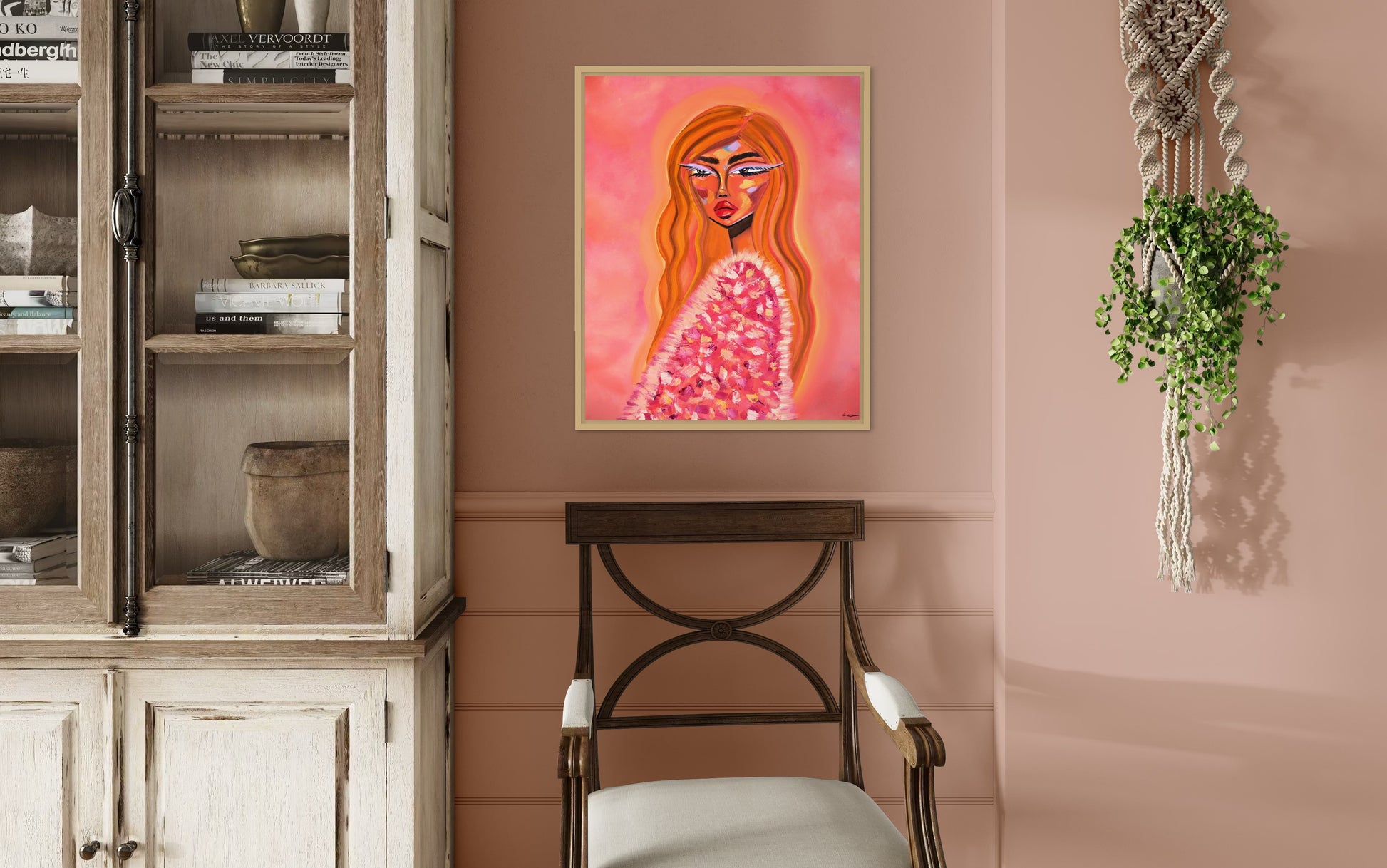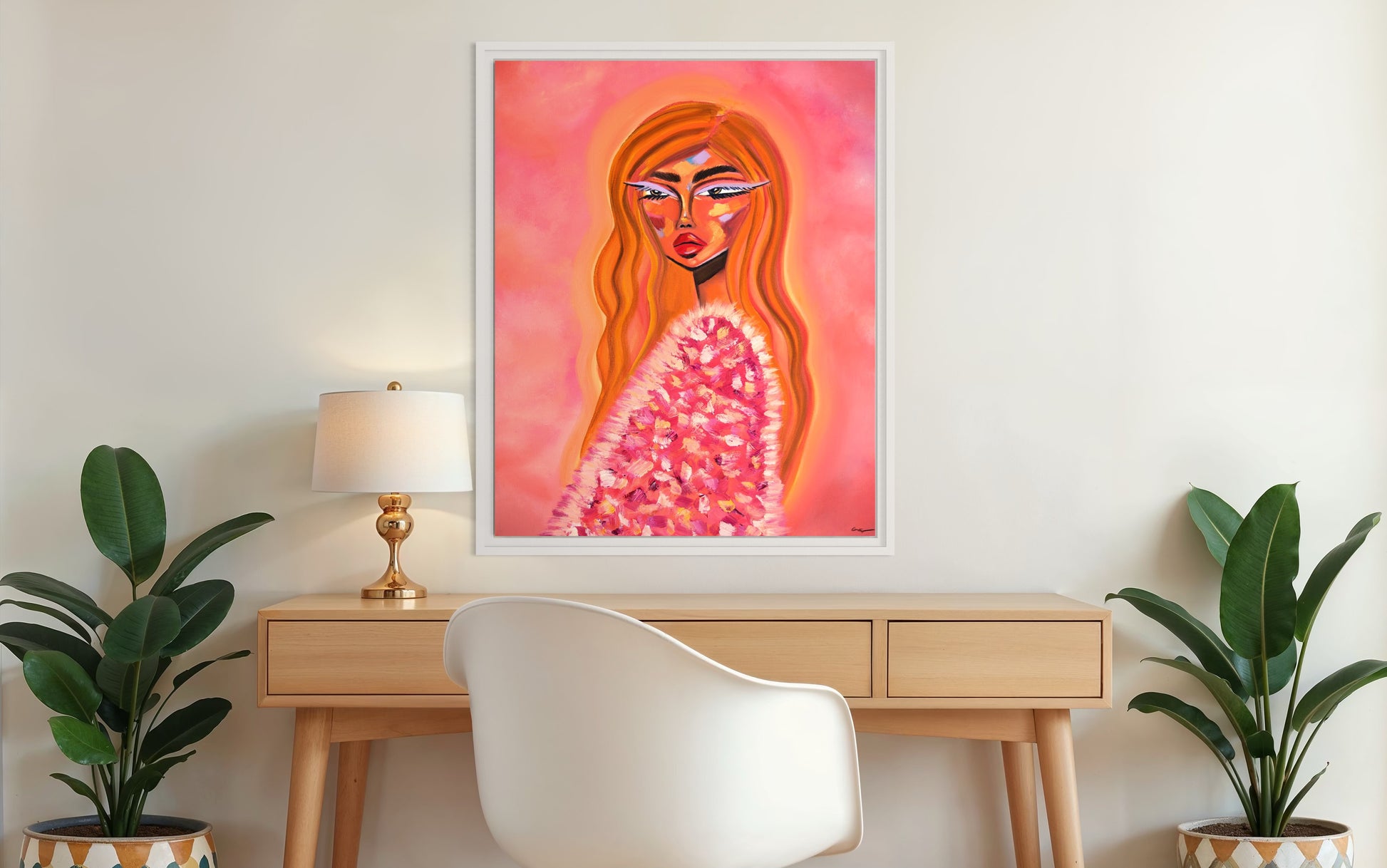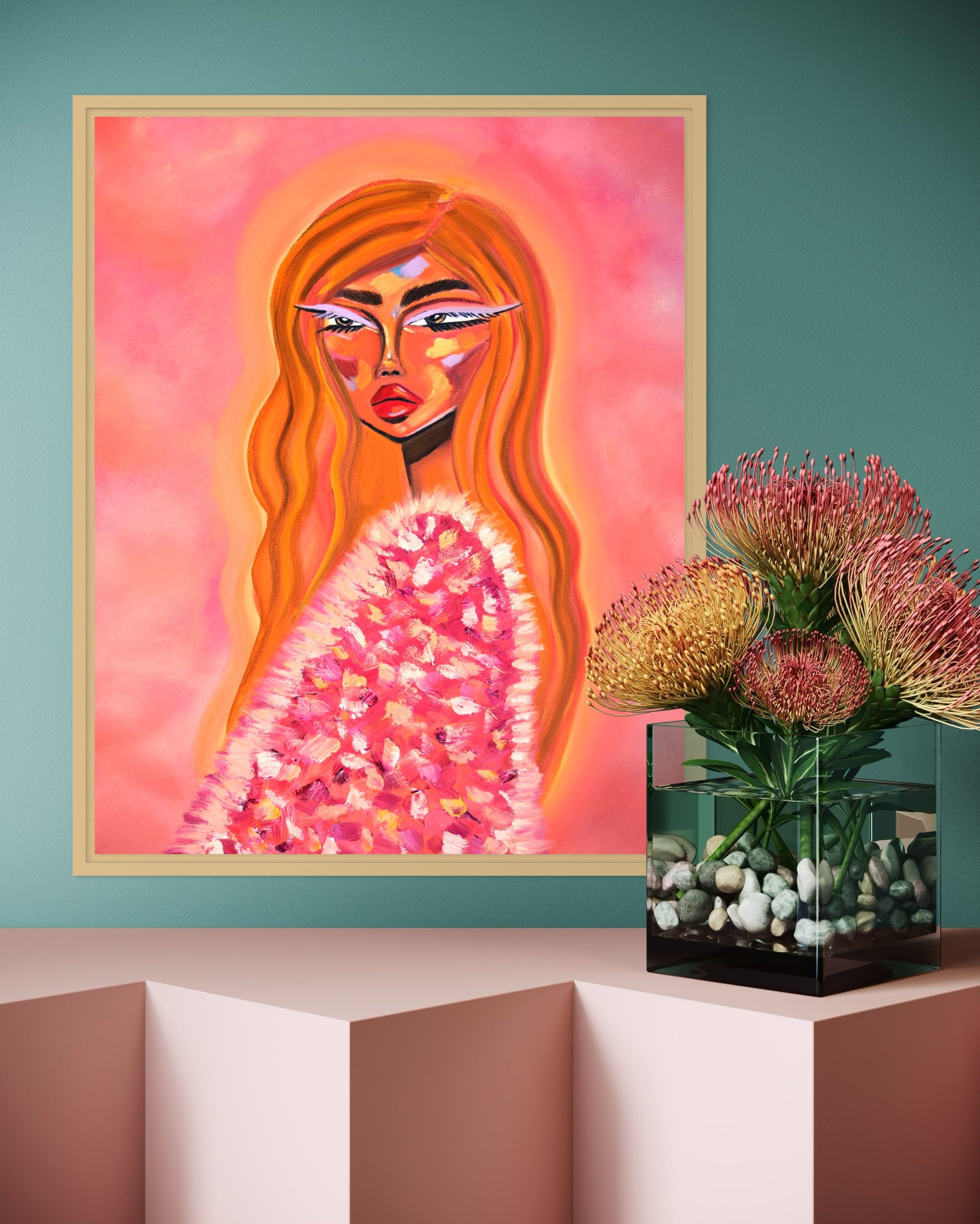 How Do You Like Your Cosmo?" is living in a cotton candy winter. Her fuzzy sweater is cozy and glam paired with lavender eyeliner. A warm sherbet orange glow around her radiates warmth and sweetness.