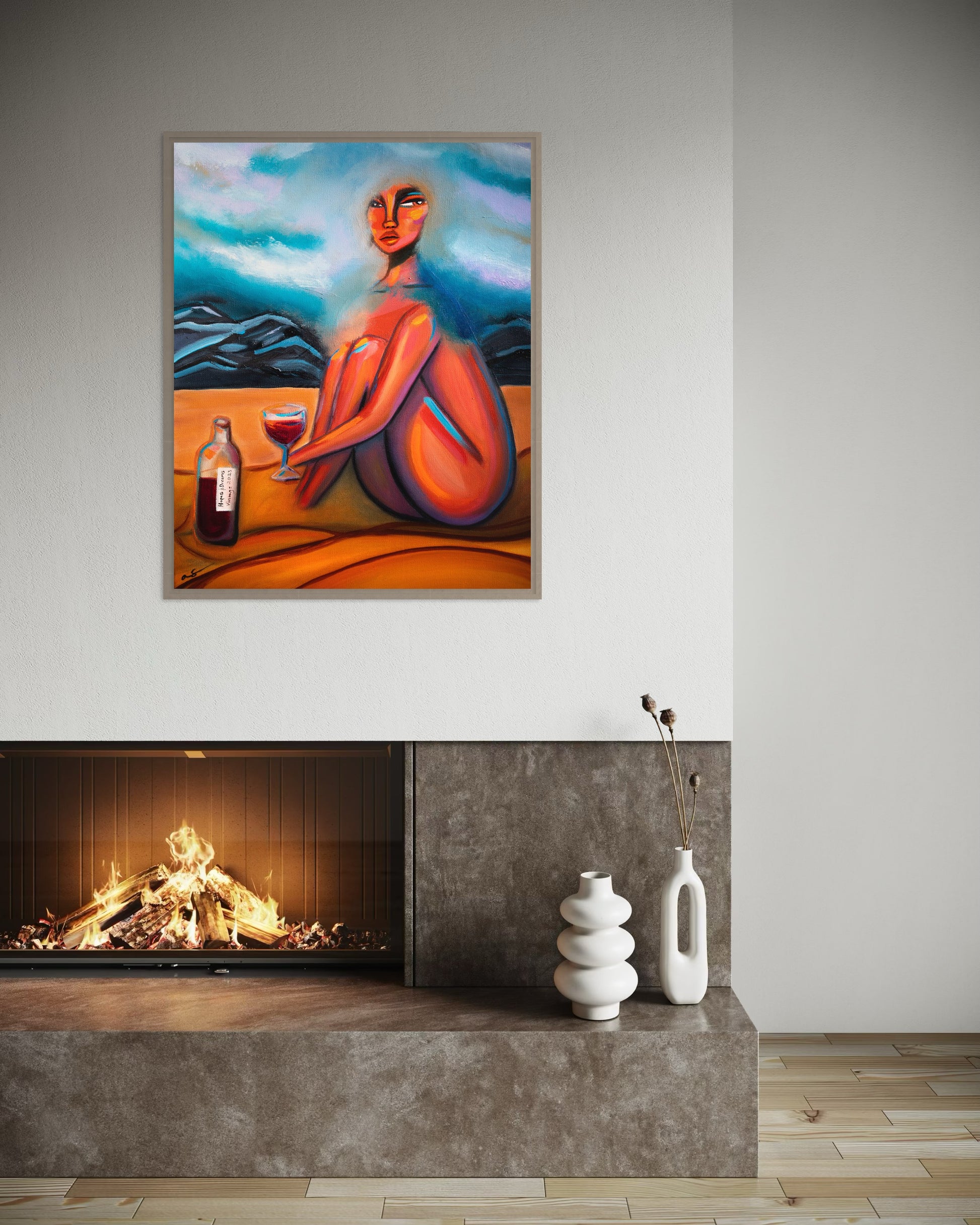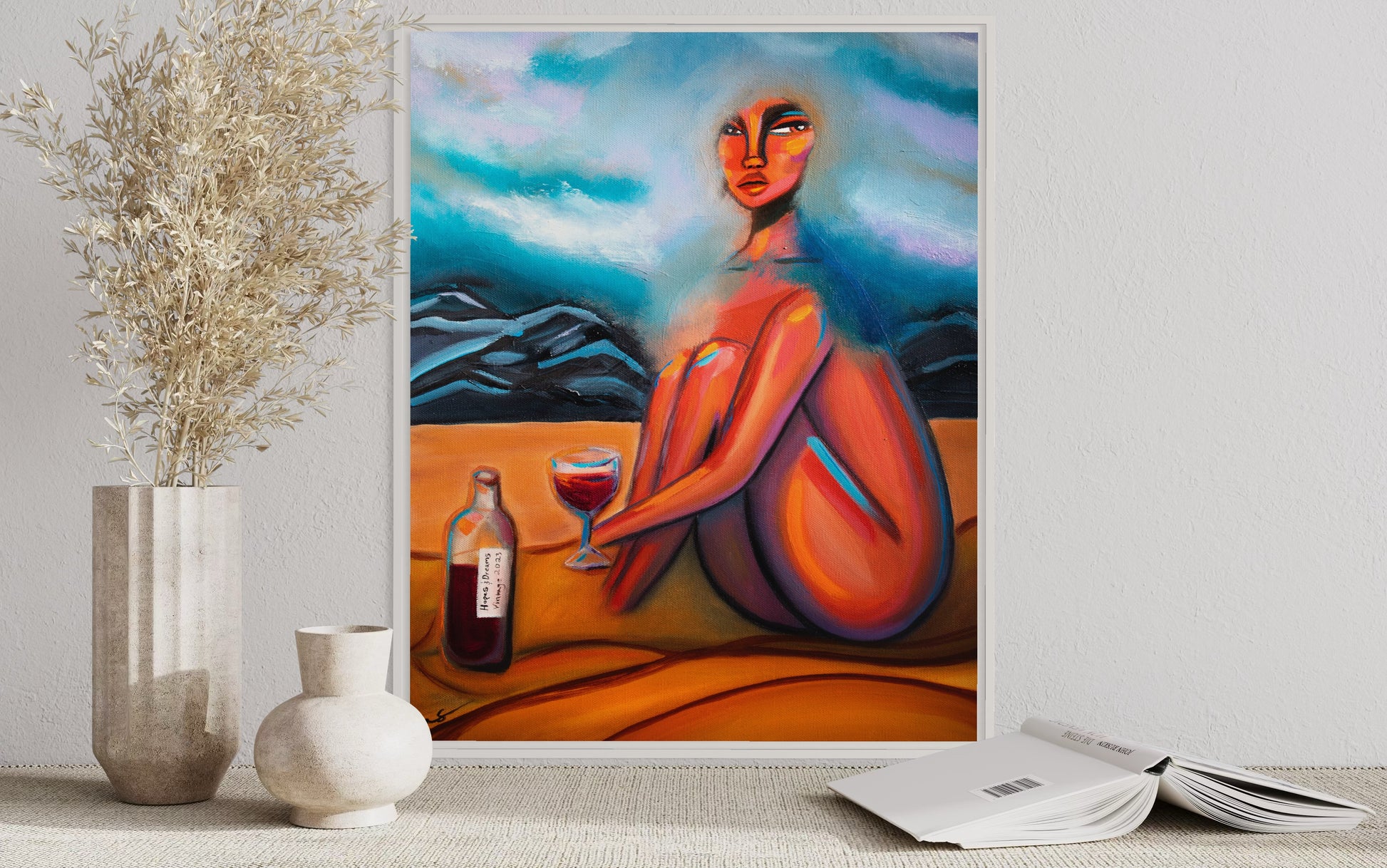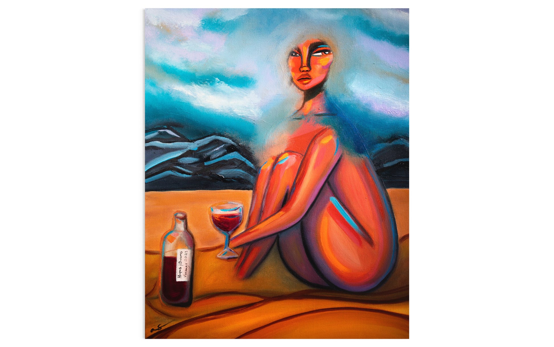 Her landscape is similar to what a lot of my dreams look like. A place that's not a place. Maybe on another planet? Her toes are in the sand and head is in the clouds. In many of my dreams I can't feel my hands, hence her handless arms. Her bottle of hopes and dreams elixir is washing over her and the bottle is a little far away so she has to reach to fill up her glass.