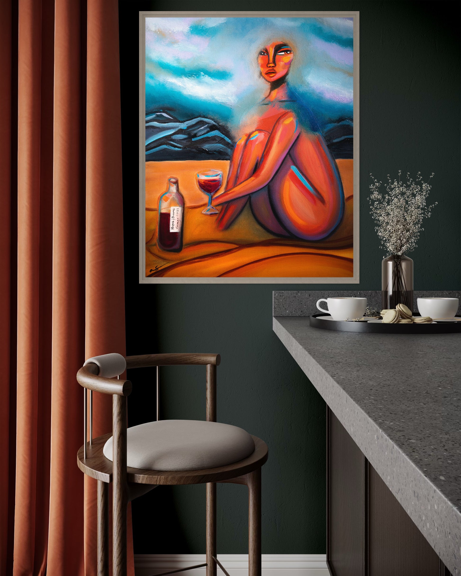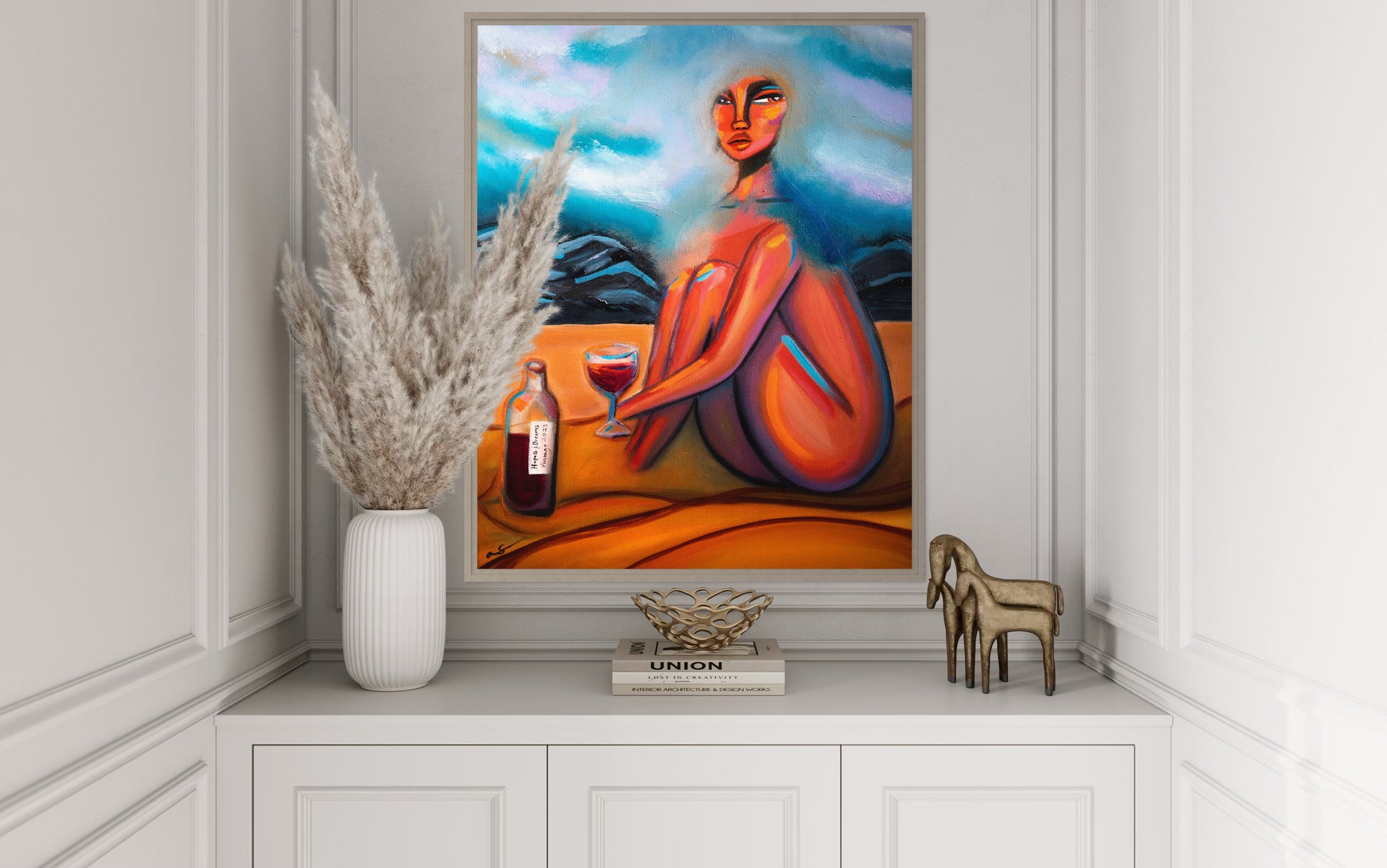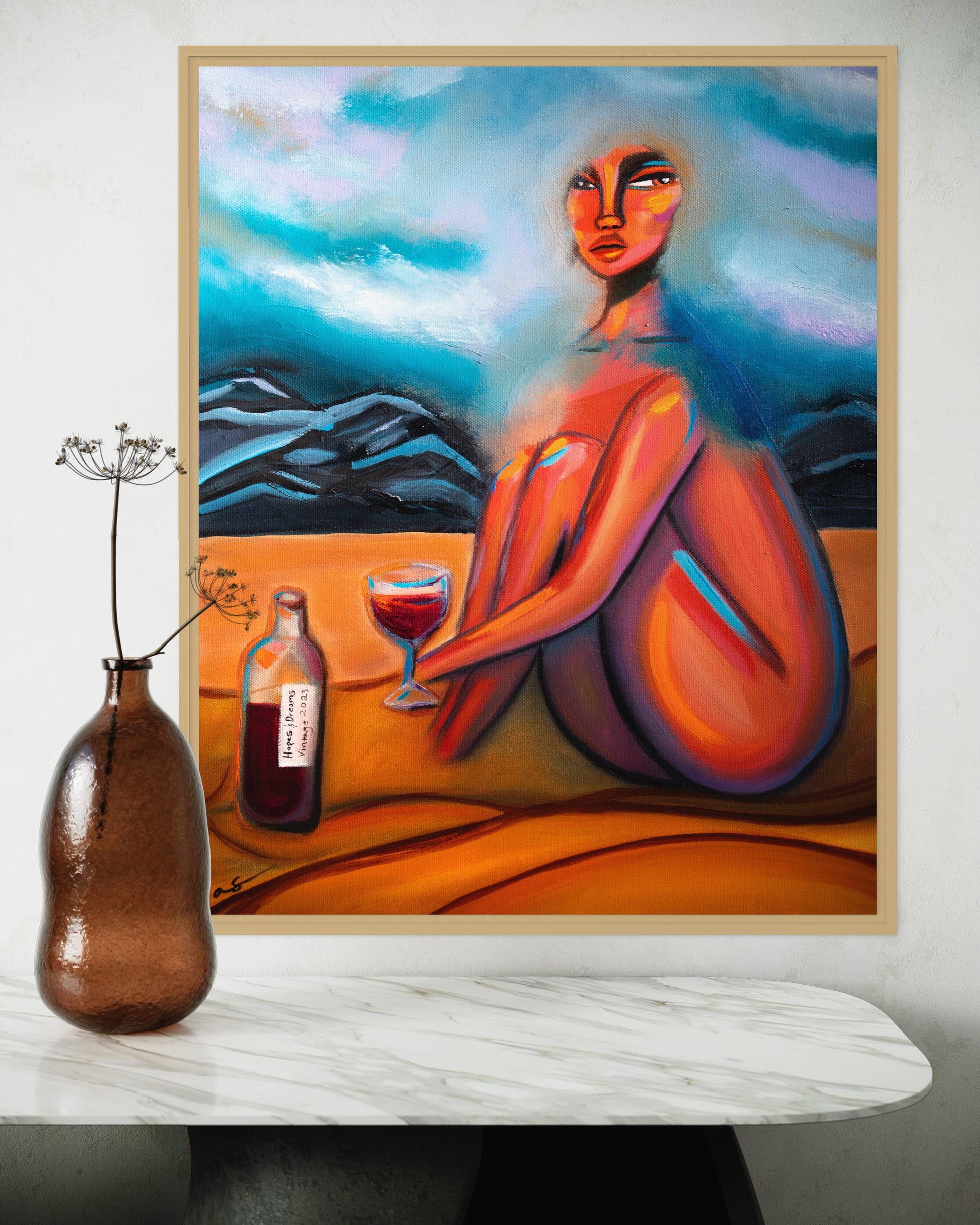 Her landscape is similar to what a lot of my dreams look like. A place that's not a place. Maybe on another planet? Her toes are in the sand and head is in the clouds. In many of my dreams I can't feel my hands, hence her handless arms. Her bottle of hopes and dreams elixir is washing over her and the bottle is a little far away so she has to reach to fill up her glass.