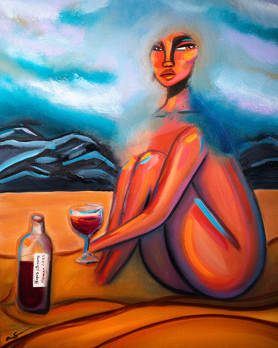 Her landscape is similar to what a lot of my dreams look like. A place that's not a place. Maybe on another planet? Her toes are in the sand and head is in the clouds. In many of my dreams I can't feel my hands, hence her handless arms. Her bottle of hopes and dreams elixir is washing over her and the bottle is a little far away so she has to reach to fill up her glass.