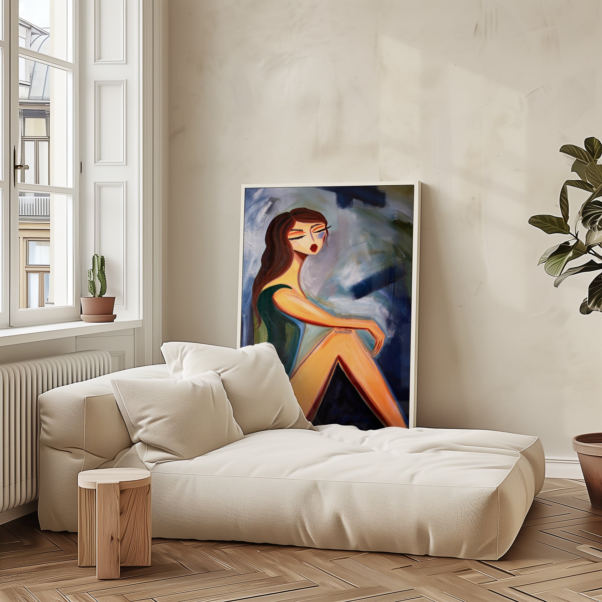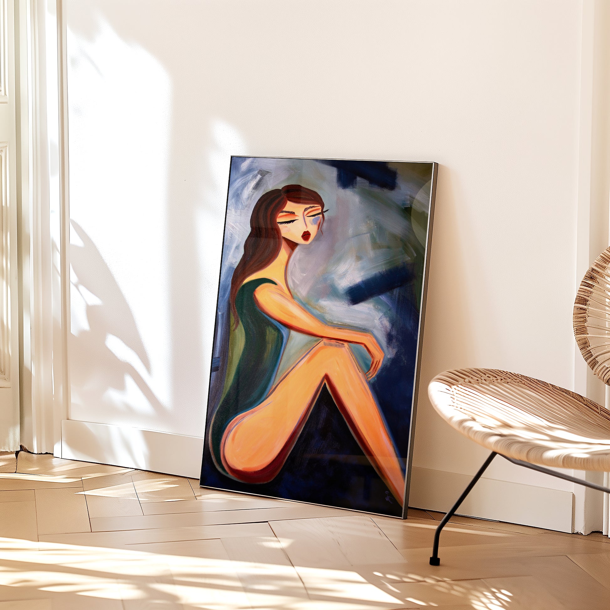 This is a fine art giclee print of an original oil painting. A dark blue, sea green, and peach artwork of a woman sitting. She radiates calming emotional energy and a feeling of zen.
