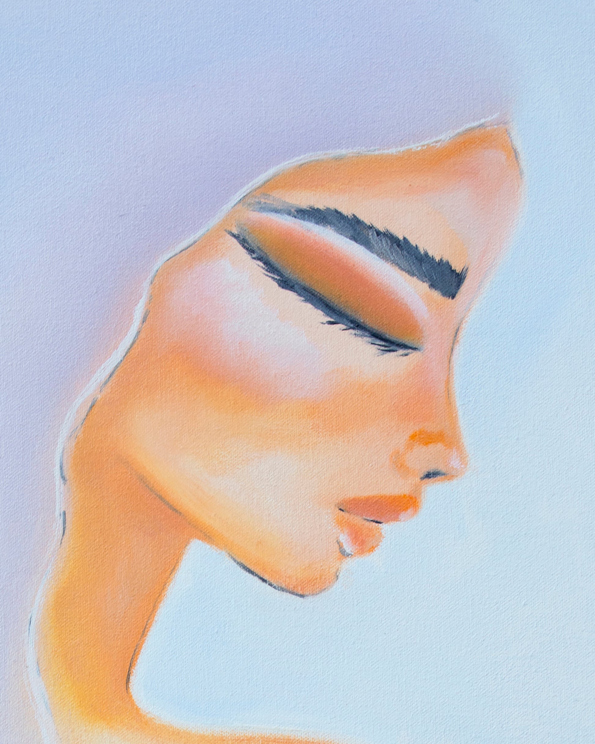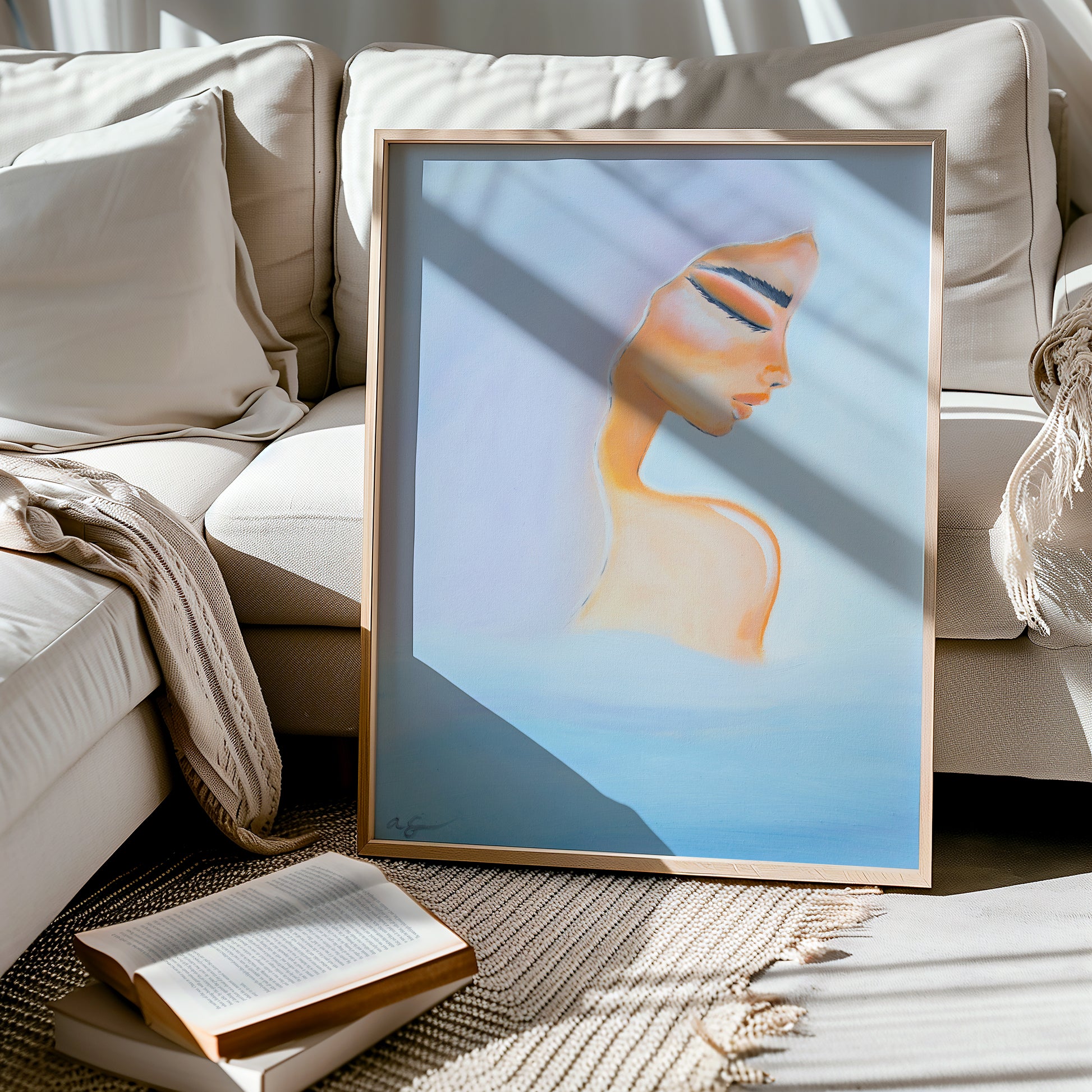 A dreamy, ethereal woman with lavender hair looking down into dreamy light blue waves. Soft and delicate she looks as if she's floating in a cloud above the sea.