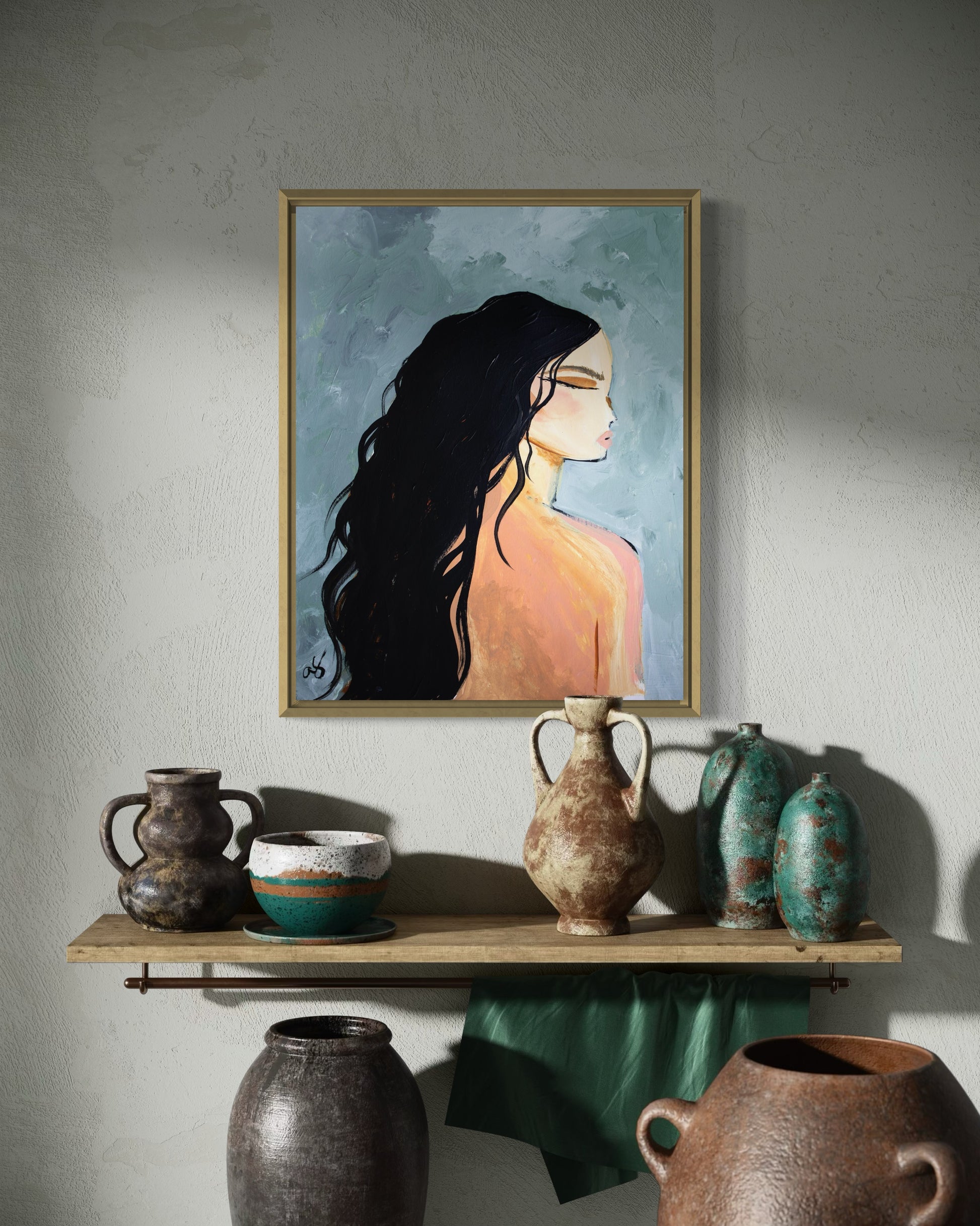Dusty teals, light bright peaches, and dark jet black. She has a boho yet contemporary feel and would fit in any style home! Beautiful paired with "Petit Allegro - Two."