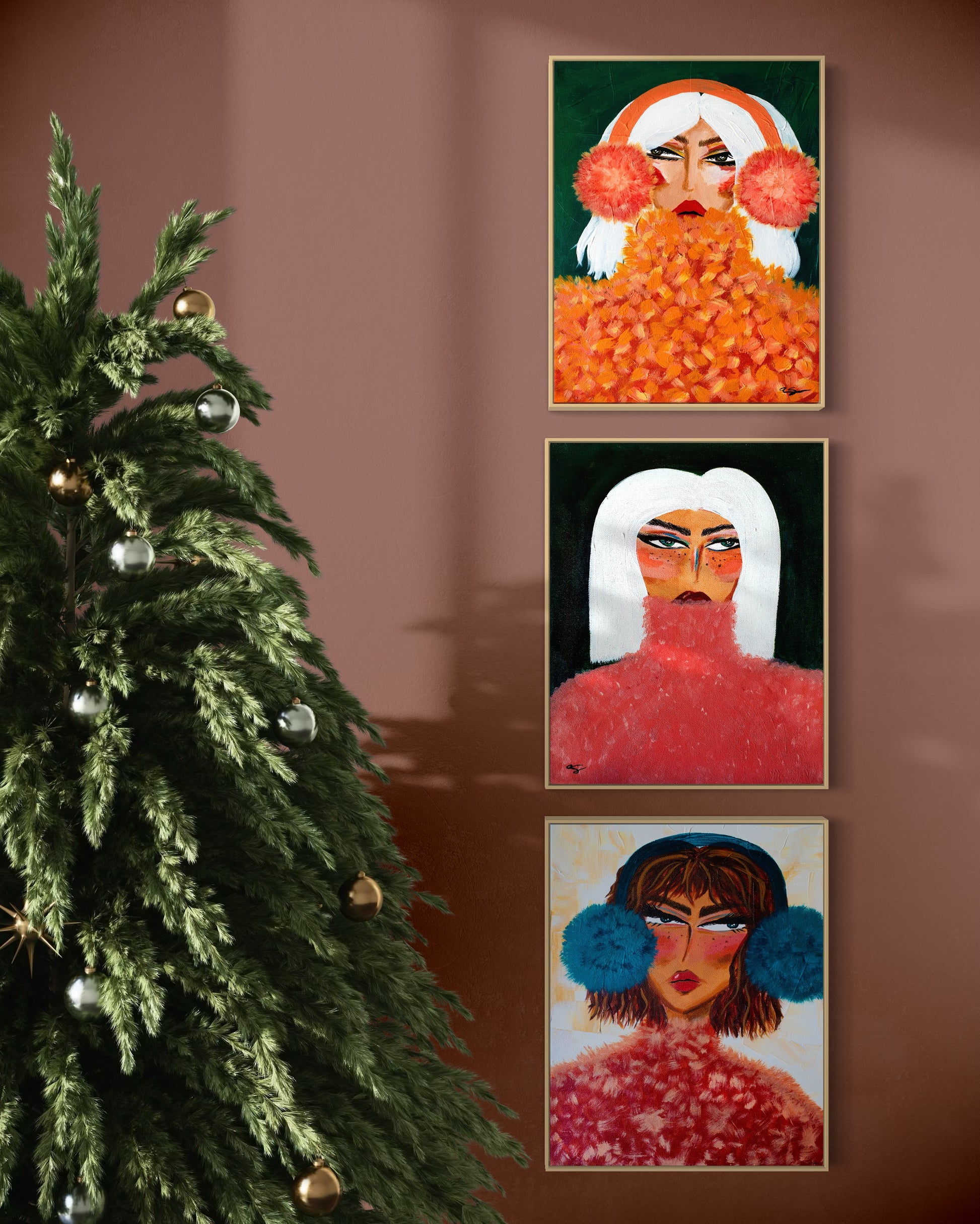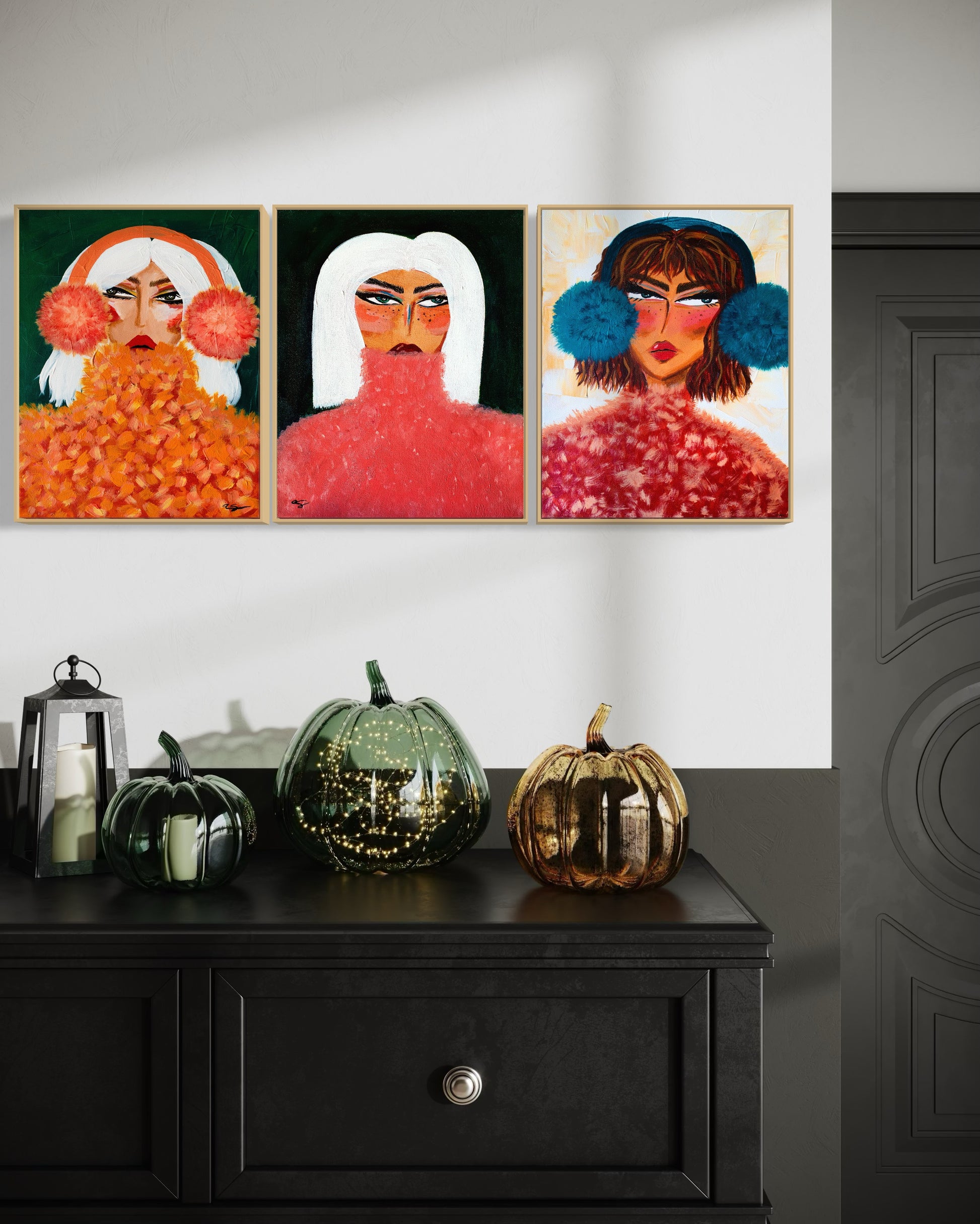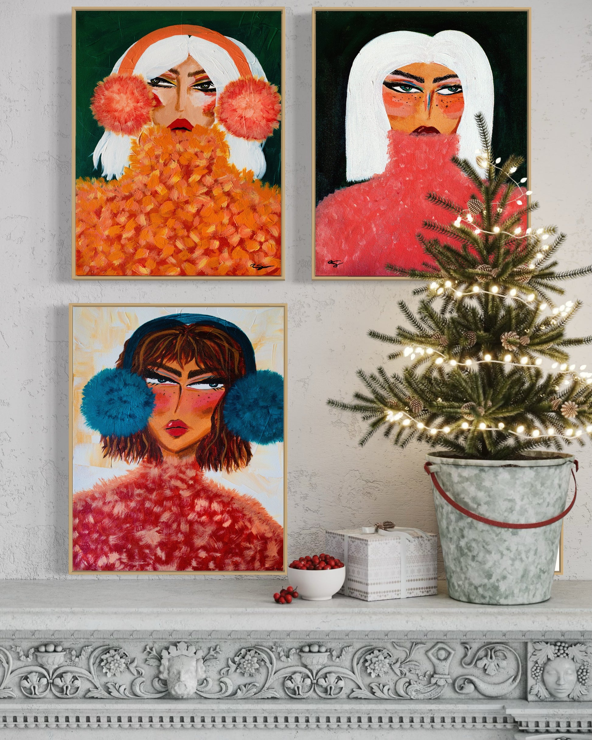 Add bold color and modern style to your winter walls with this set of three fashion portrait art prints. Each print is a unique, strong, expressive woman in cozy textured sweaters and oversized earmuffs.