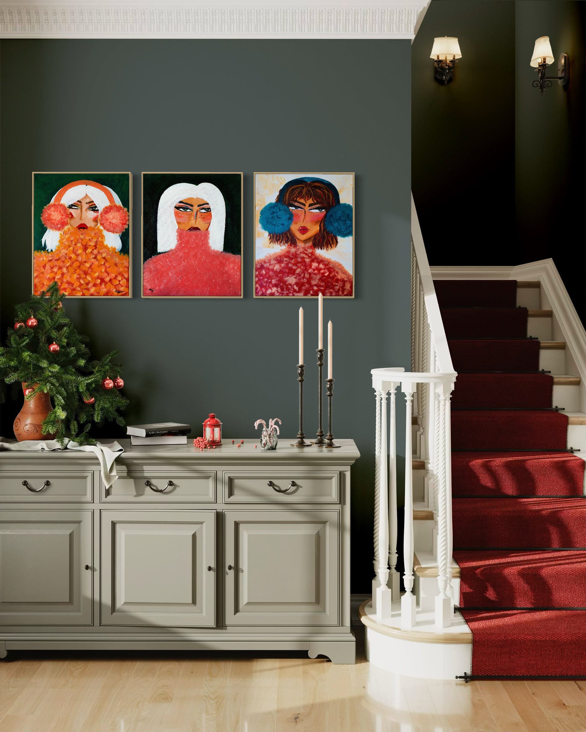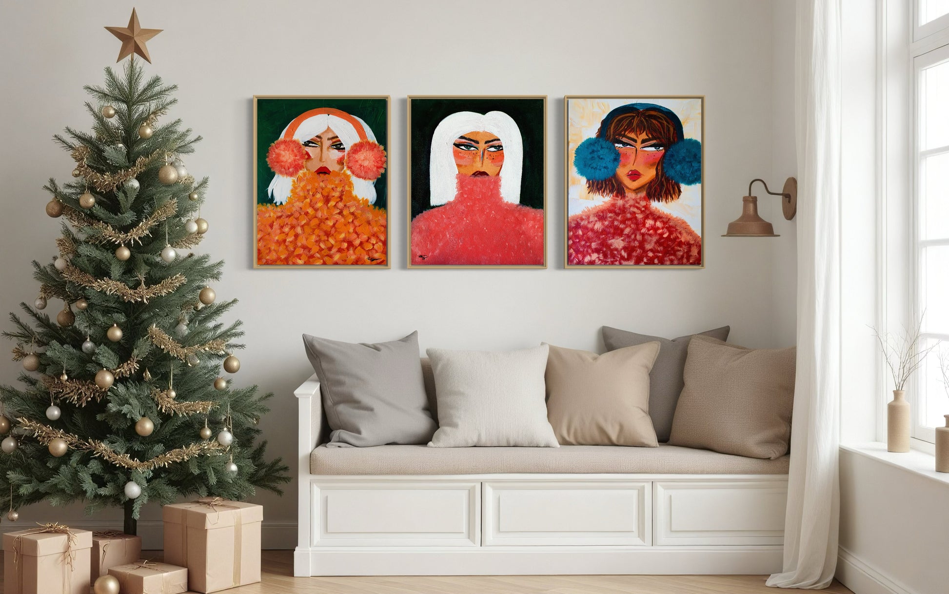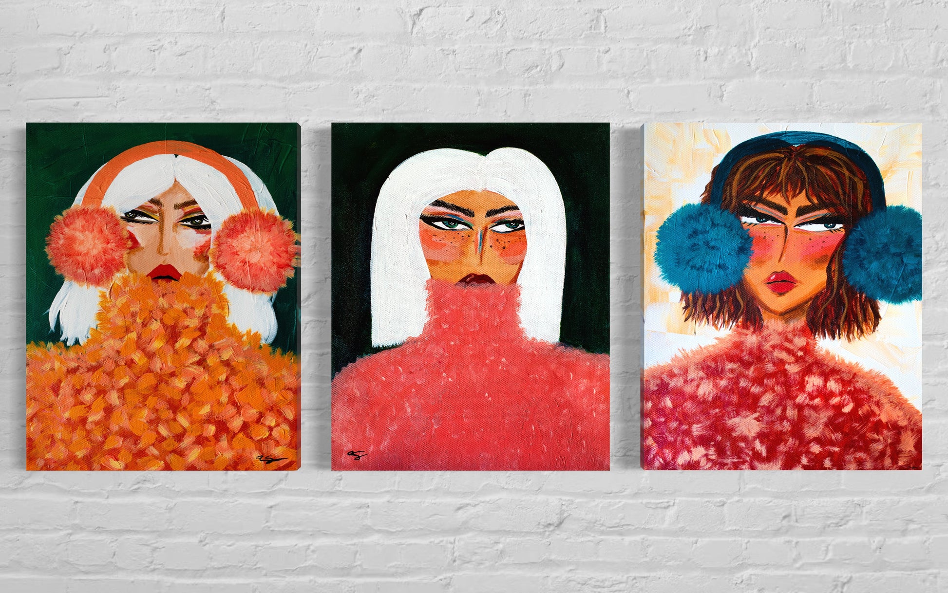 Add bold color and modern style to your winter walls with this set of three fashion portrait art prints. Each print is a unique, strong, expressive woman in cozy textured sweaters and oversized earmuffs.
