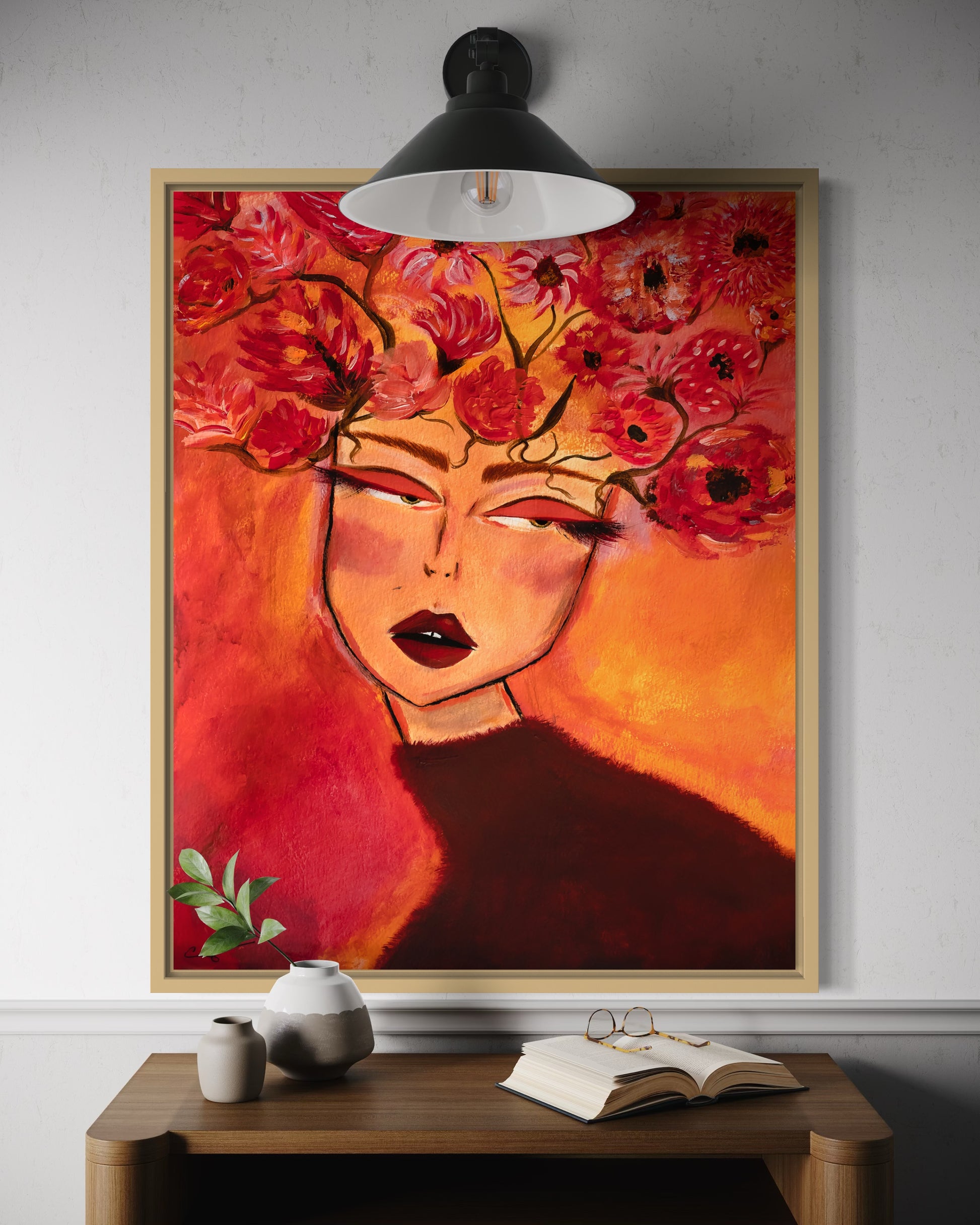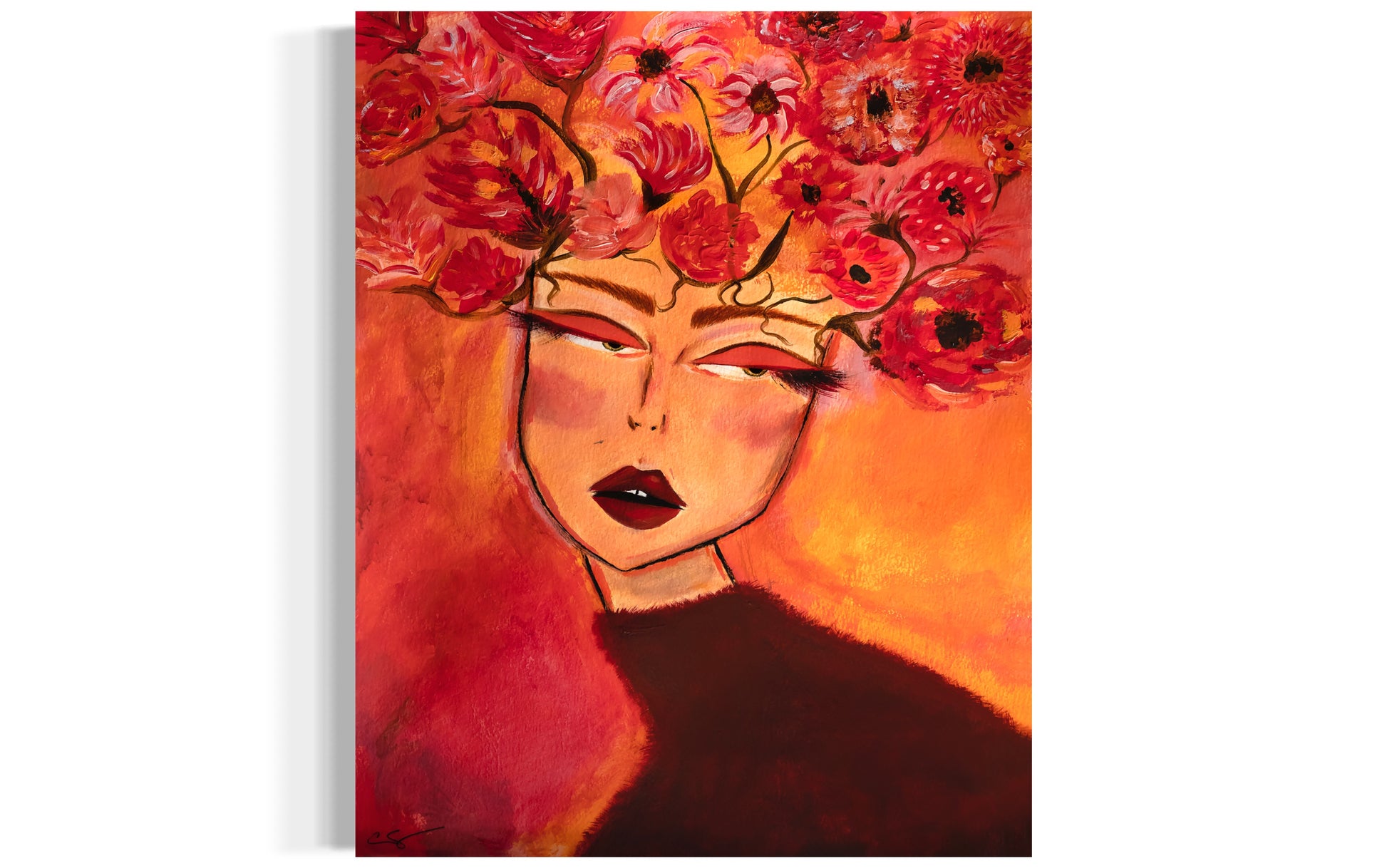 "Thanks, It's Cashmere" is warm and cozy. Her fuzzy sweater is a deep burgundy wine, against a sunset of sherbet orange and bright reds. Her mind is full of fall florals highlighted with soft pink.