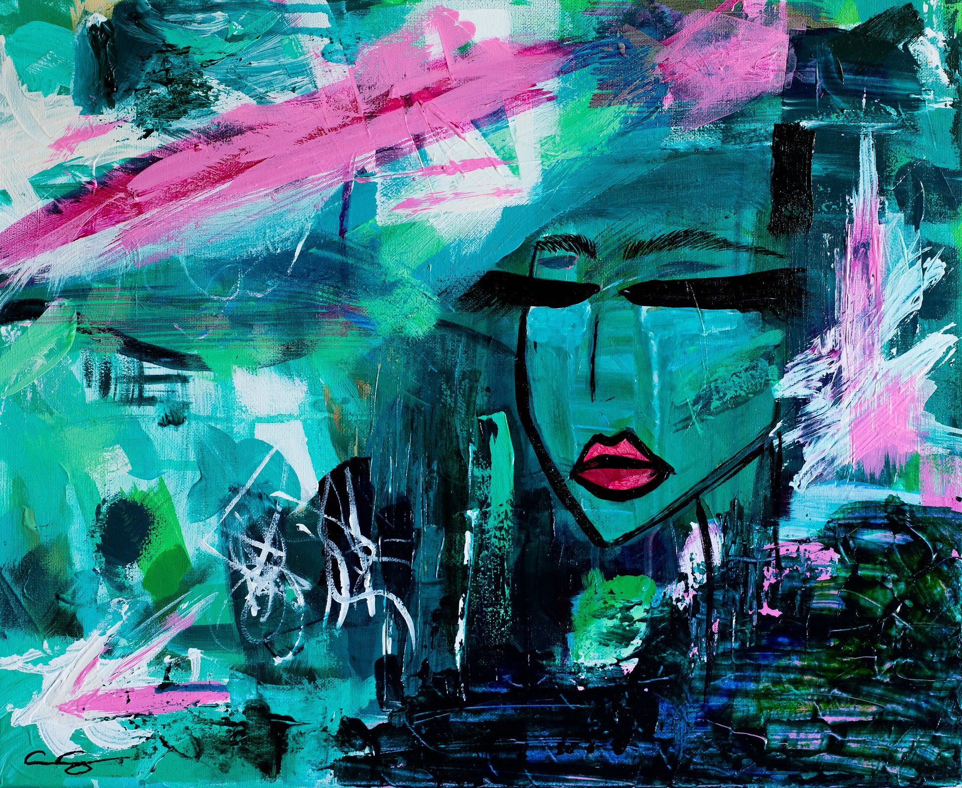 Graffiti style abstract in dark teals, bright violets, and splashes of white.